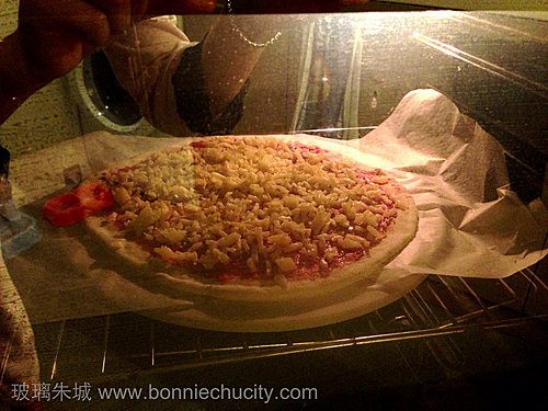 5) 放入焗爐中間偏低位置,用最大火焗8分鐘(我的焗爐之後再要轉面火焗多3分鍾去令Pizza面金黃香脆)