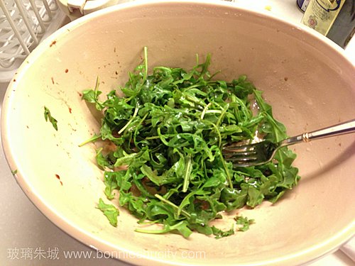 6) Rocket洗淨瀝乾,加入少許意大利黑醋及橄欖油拌勻,備用.