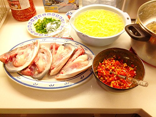 1) 魚頭洗淨, 加入鹽及生粉醃. (鹽不要下太多因剁椒本身也很鹹)