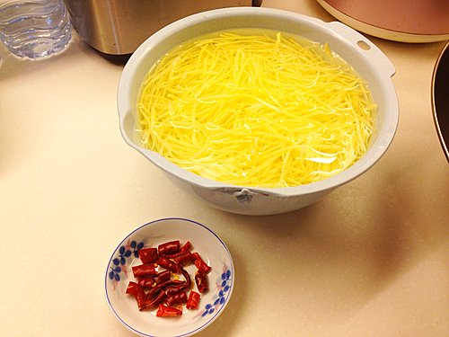 1) 馬鈴薯絲用水浸 ( 最少半小時以上) , 瀝乾備用. ( 此程序就是令馬鈴薯爽口不稔的秘訣)