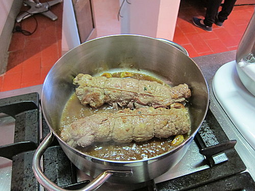 首先煮Tuscan Veal Roll with Artichoke , Veal 要加少少水壓平, 再在外邊橫CUT幾下, 讓肉可伸展大點.