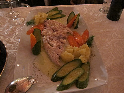 這才是我們的MAIN COURSE, 是SOLE....已經吃不了, 叫他們停了. 全餐吃得很飽, 很滿足, 他們多用蒸或BOIL來做菜, 火喉亦是剛好, 全餐晚飯大約200元歐羅, 一流的餐廳!