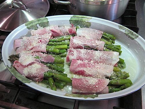 煲熟Asparagi, 點些Olive oil, 卷起, 再落少少parmesan cheese, 焗15分鍾即成.