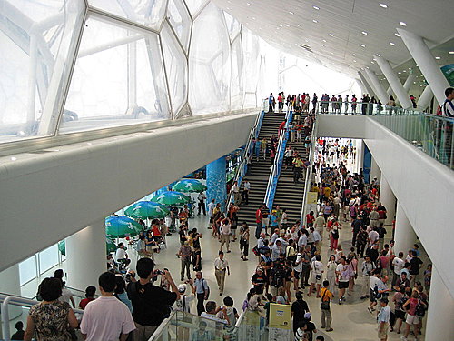 水立方內的大堂, 有小食部但無嘢食賣(賣晒), 有賣記念品但又係所餘無幾...