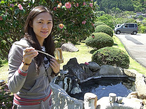 之後, 我們再小睡一小時, 十時CHECK OUT. 今天的行程緊湊, 臨走前再向小狗們道別, 又見到有個天然的溫泉井, 飲一下才上車...好熱呀...之後, 便駕車往那智去了...