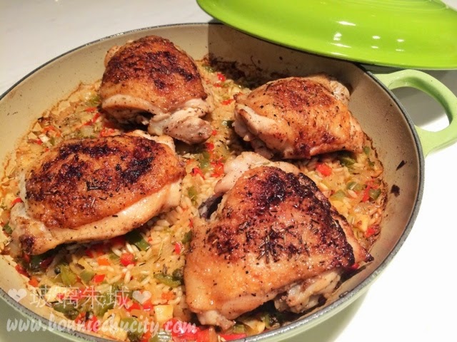有一次在一間西餐廳吃到一個好美味的青紅椒焗飯,已經一直想一試。之後再想想如何可以令焗飯更有特色,覺得「雞」與這個味是最配合不過。結果便自創了這個[彩椒烤雞焗飯]!材料又簡單又易做!即刻為大家示範。 2-4人份量 材料: 雞上脾---4件 意大利米---1cup(你亦可以用其他米) 青椒---半個(切碎) 紅椒---半個(切碎) 洋蔥---1/4個(切碎)或可用... 看全文 -