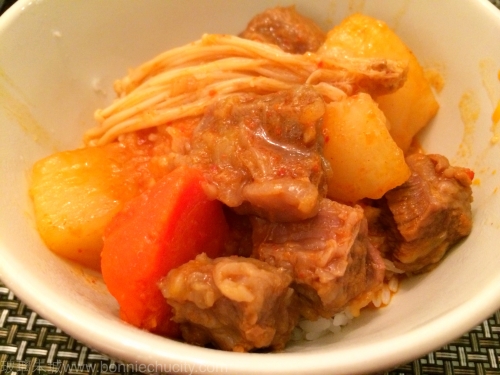 每次去韓國餐廳,都一定叫他們的辣海鮮湯麵。很喜歡韓式辣湯(沒有Kimchi那種)!最近老外榮亦十分嗜「辣」,今次就做這個「韓式炆辣牛肋條」給他,他吃後大為喜歡! 材料: 牛肋條---10條(約600g切塊) 甘荀---2條(切塊) 白蘿蔔---半條(切塊) 金菇菜---1包 洋蔥---1個(切條) 蒜頭---3粒(切片) 調味料: ... 看全文 -