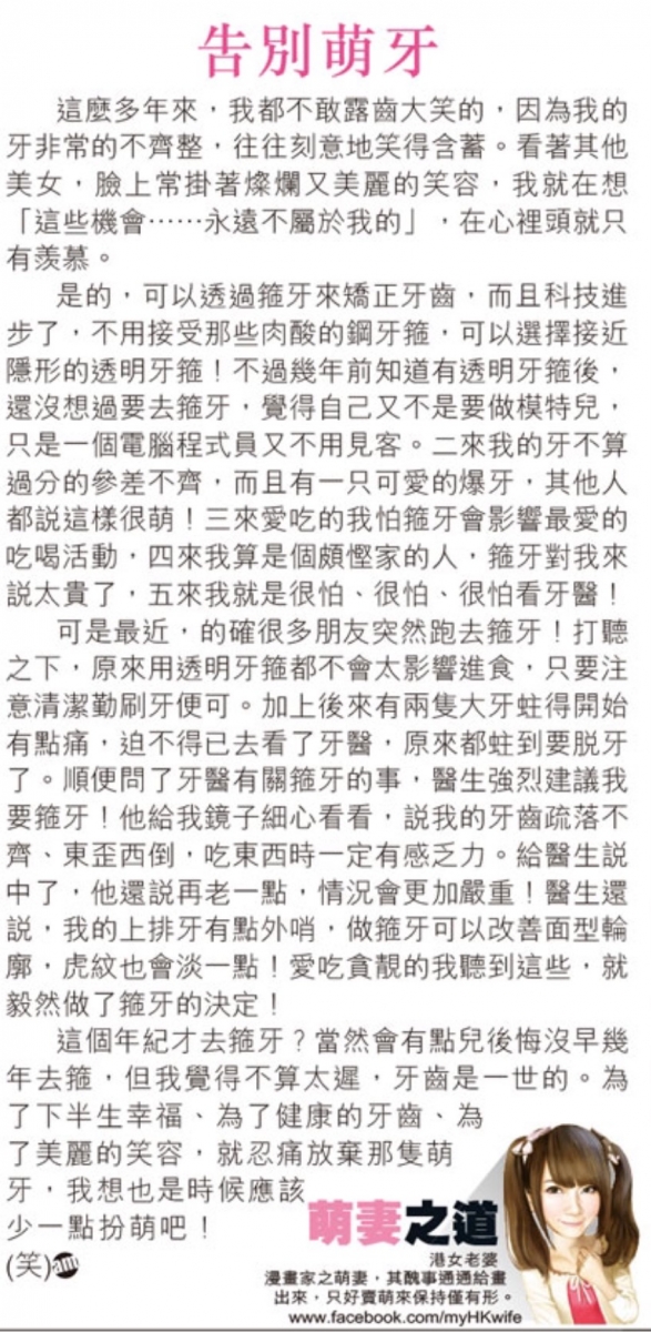 我想隆重地宣佈一個重要的決定,就是決定放棄我那只可愛的「萌牙」! 這麼多年來,我都不敢露齒大笑的,因為我的牙非常的不齊整,往往刻意地笑得含蓄。 看著其他美女,臉上常掛著燦爛又美麗的笑容,我就在想「這些機會... ... 永遠不屬於我的」, 在心裡頭就只有羡慕! 雖知道可以透過箍牙來矯正牙齒,而且現在科技進步了,不用接受那些肉酸的鋼牙箍, 更可以選擇接近隱形的透明牙箍!但當時還沒想過要去箍牙的原因是: 一來覺得自已又不是要當模特兒,只是一個普通的... 看全文 -