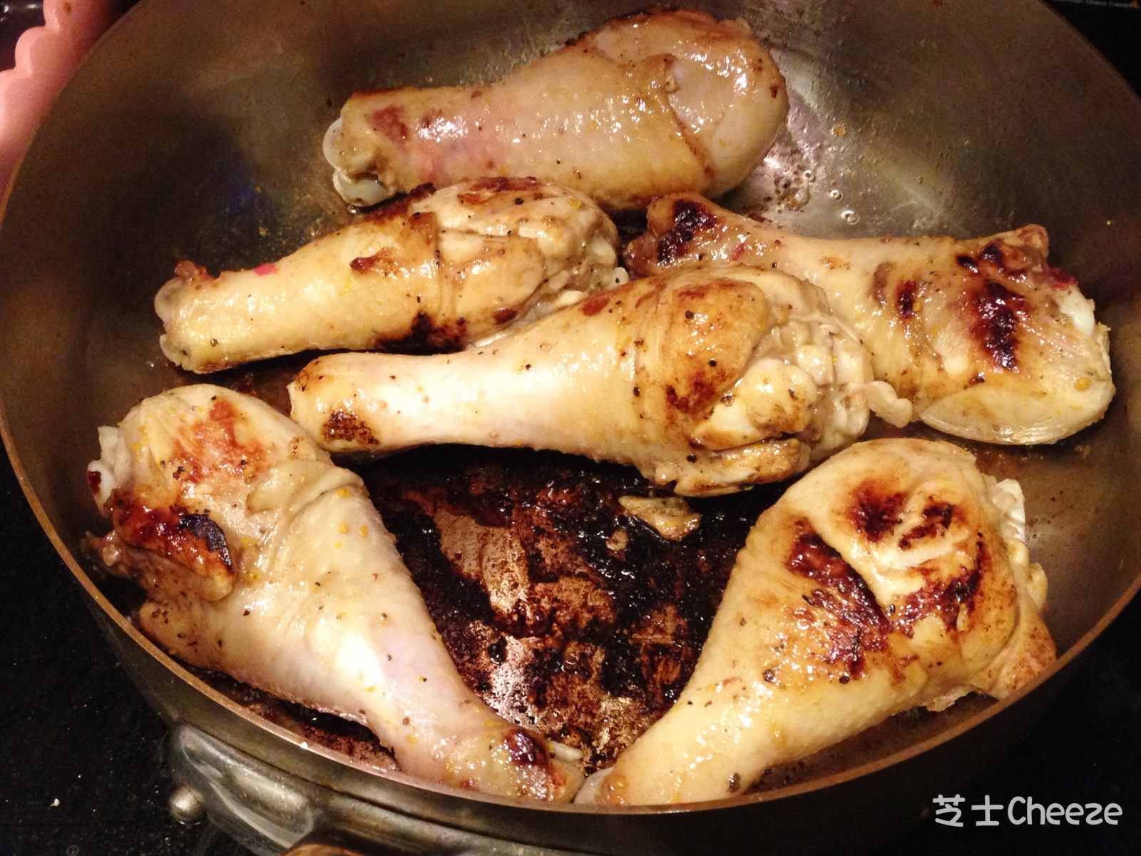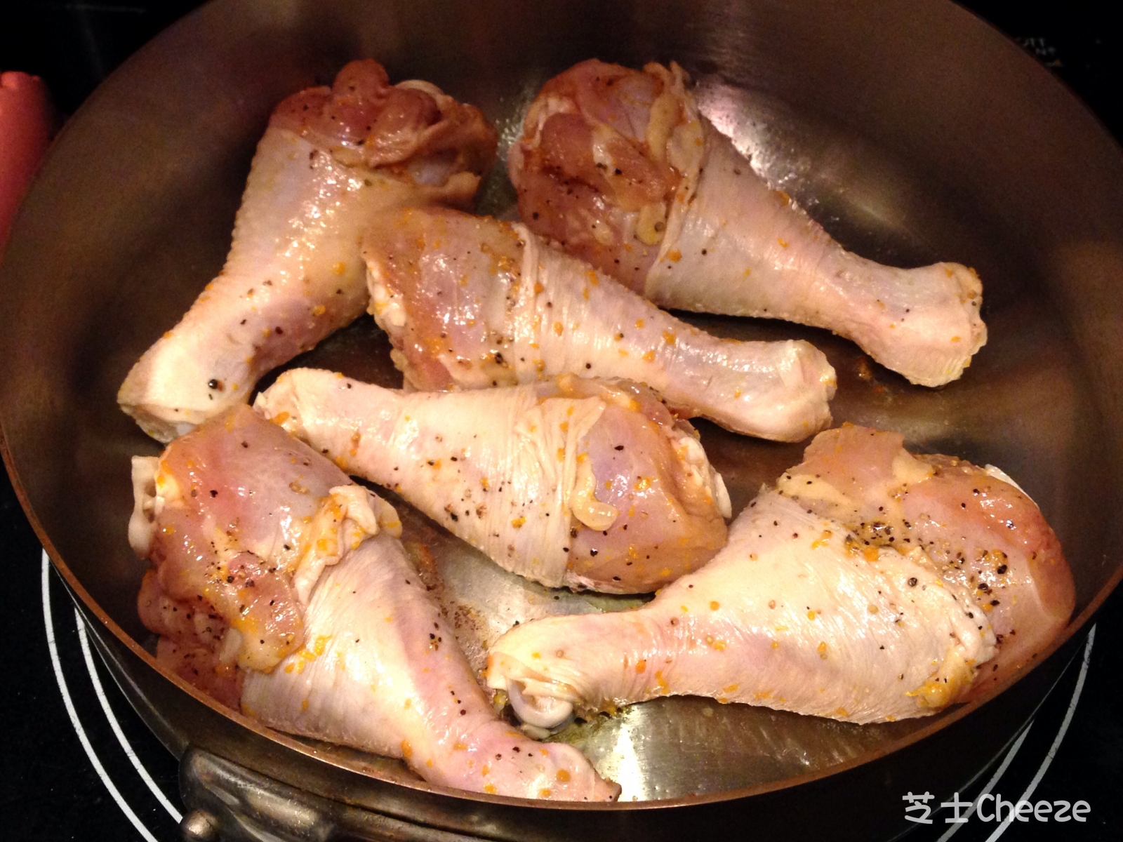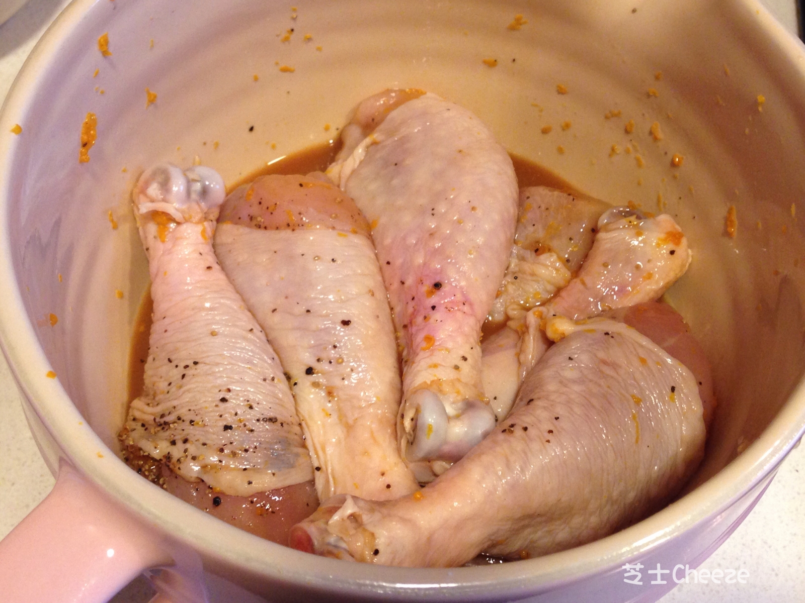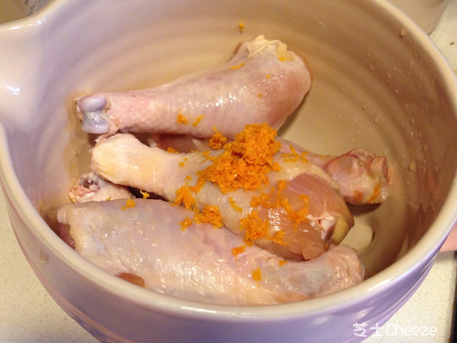2. 雞腿洗乾淨, 抹乾水份, 加入半個橙皮, 黑椒, 海鹽, 半個橙汁, 30ml砵酒醃最少半個鐘。(喜歡的話可用少許醬油同醃)