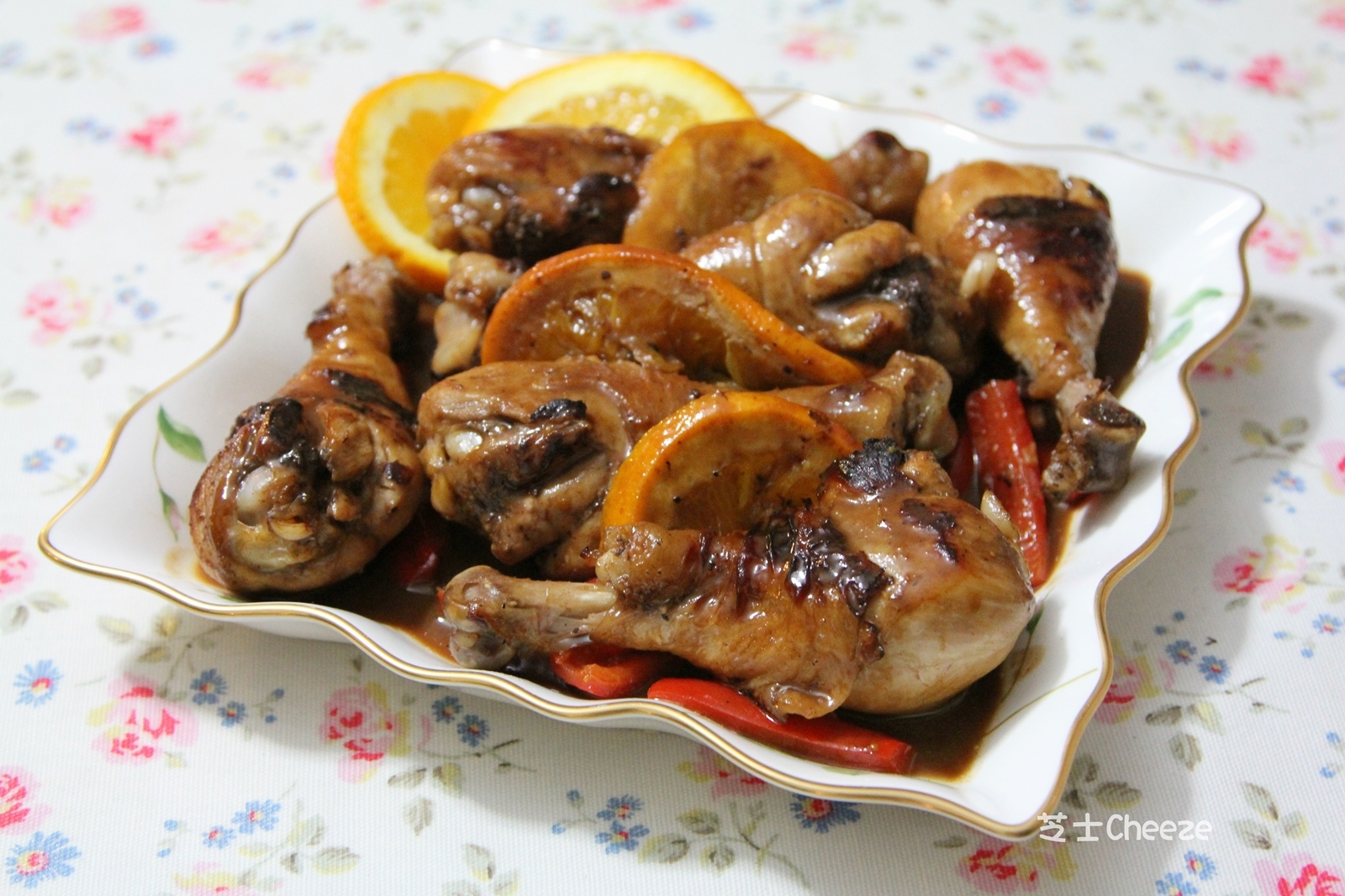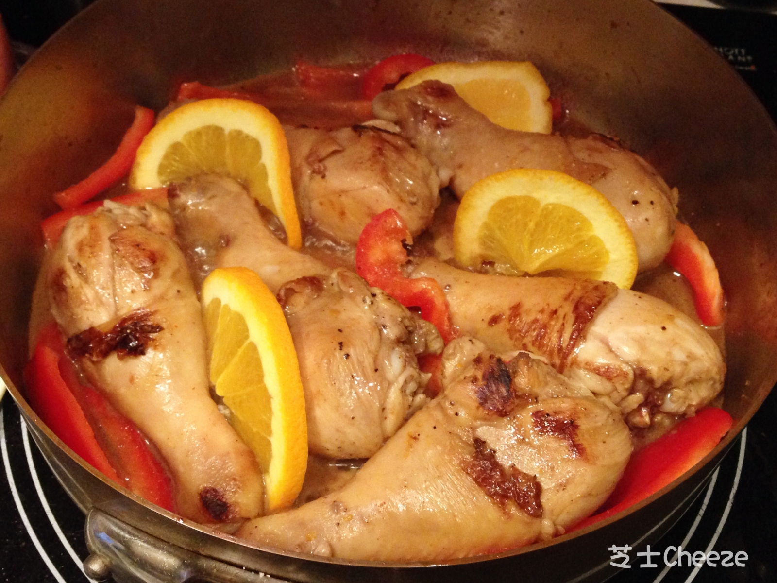 5.雞腿焗好後, 取出雞腿, 紅椒及橙片, 將汁料加1湯匙砵酒用大火將汁料收至濃縮, 再淋上鷂腿上, 即成。(最後加入砵酒收汁是為想砵酒味更濃, 如果不想太大酒味可不加)