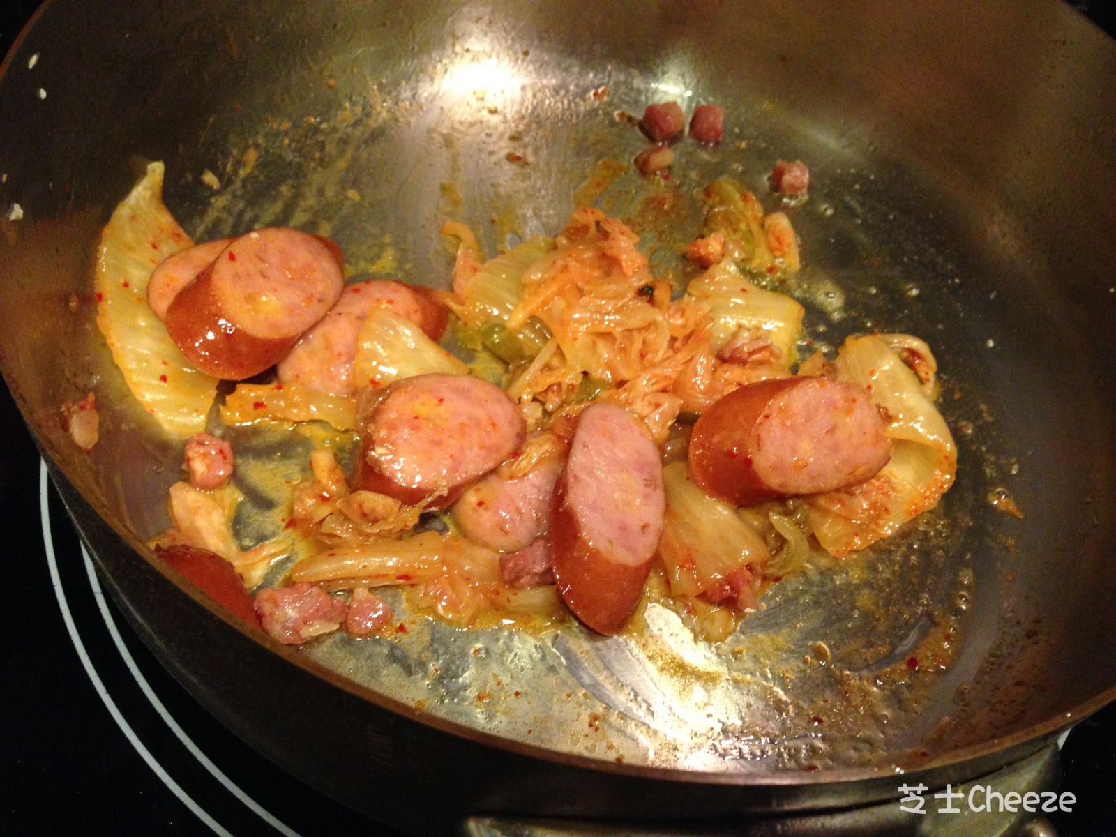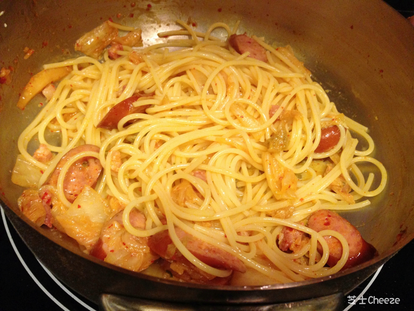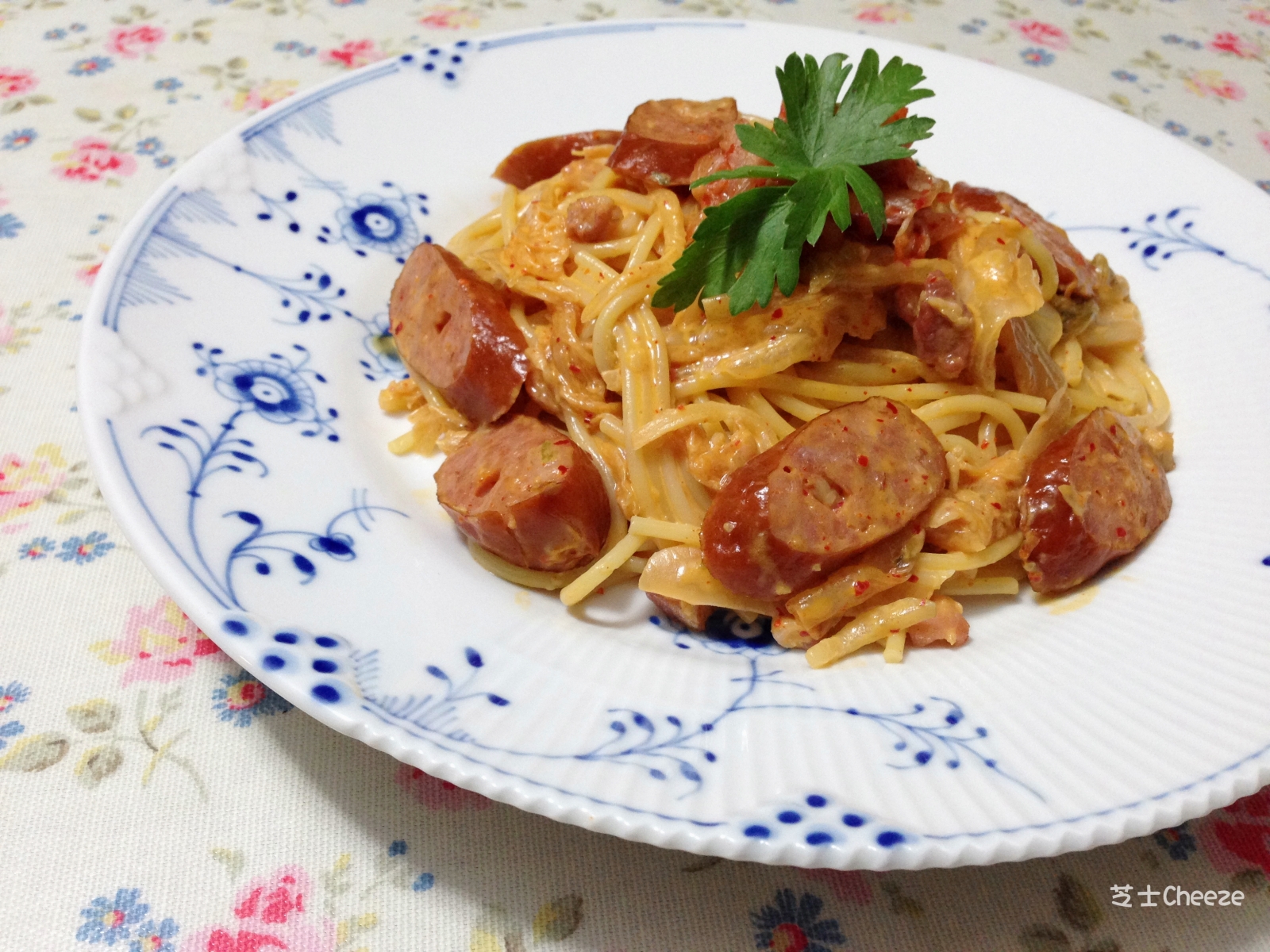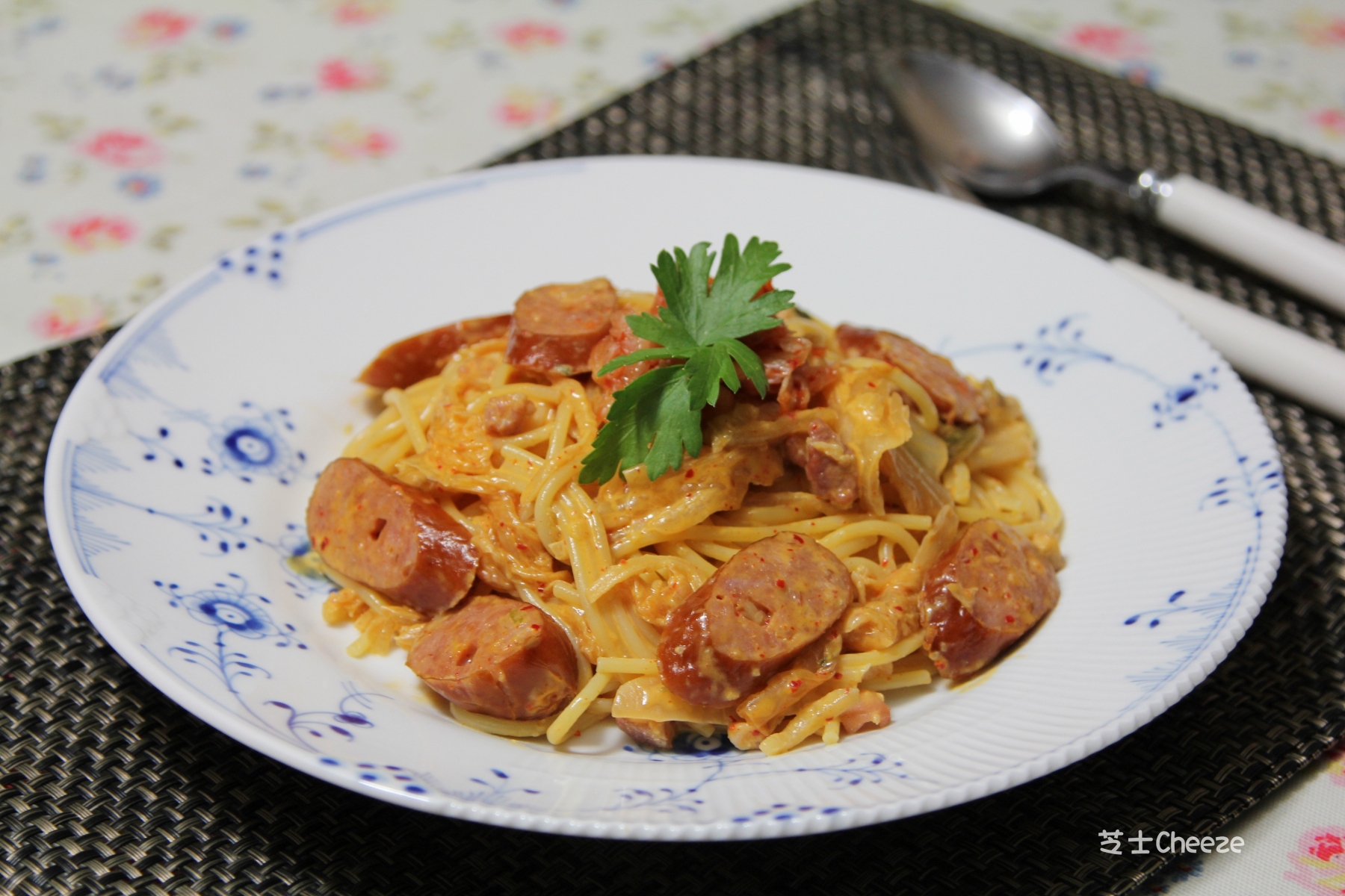 我也湊熱鬧來了一客, 剛好一個人吃晚餐, 家中只有德國腸, 所以就用了德國腸加泡菜做意粉. 這個意粉快靚正, 是懶人快餐的不二之選.