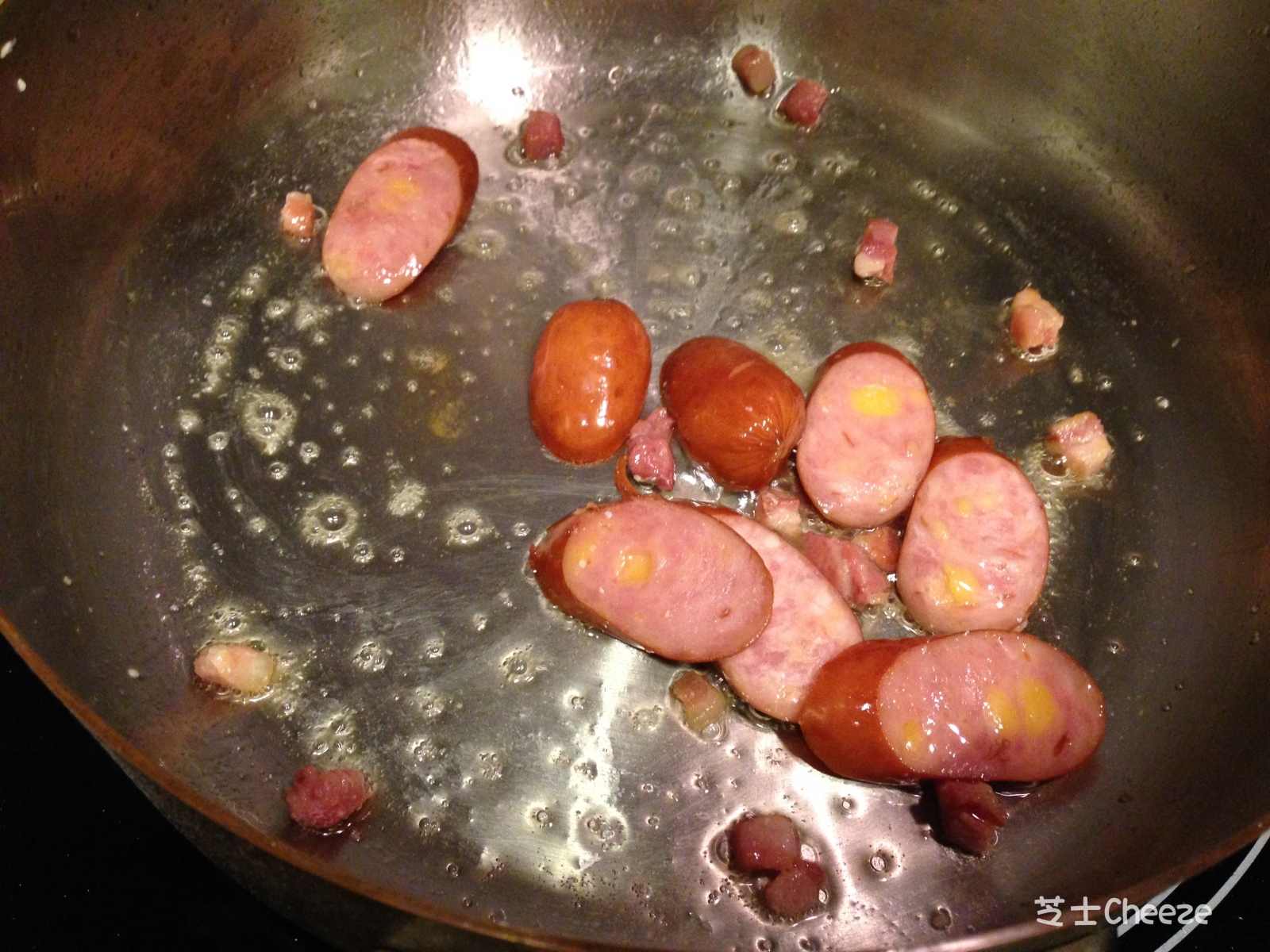 2. 先爆香煙肉粒至脆身, 加入香腸煎至金黃;