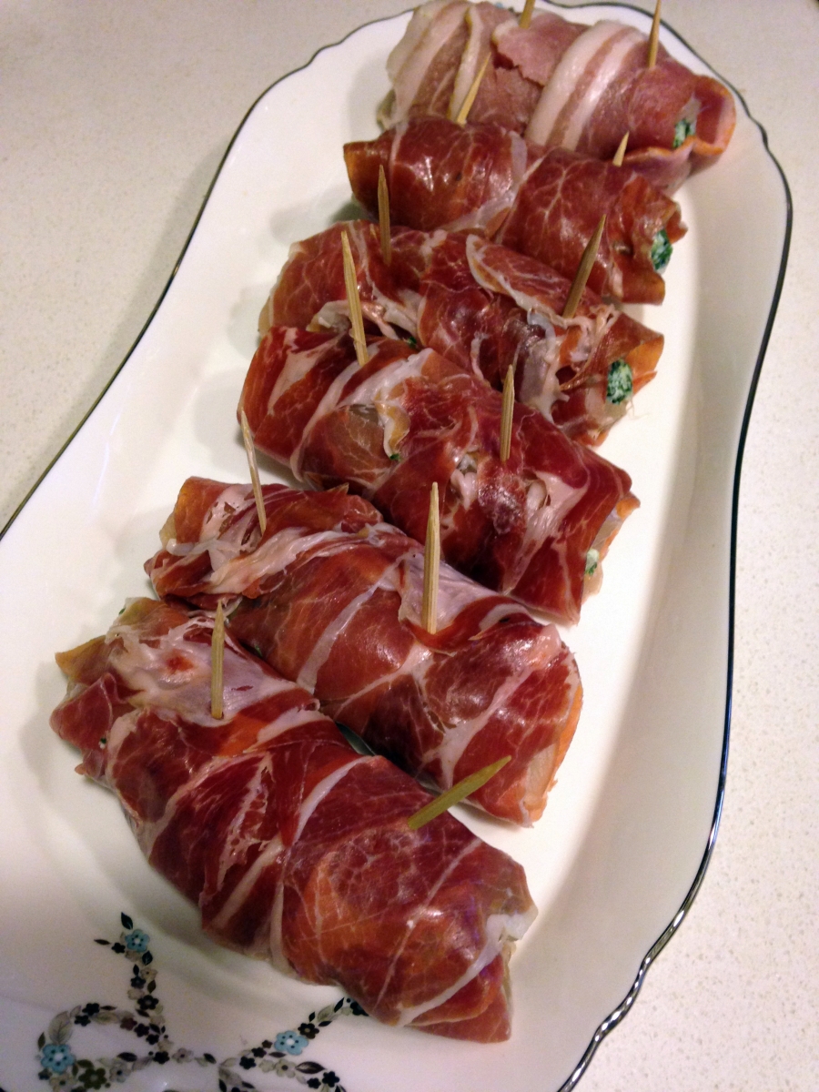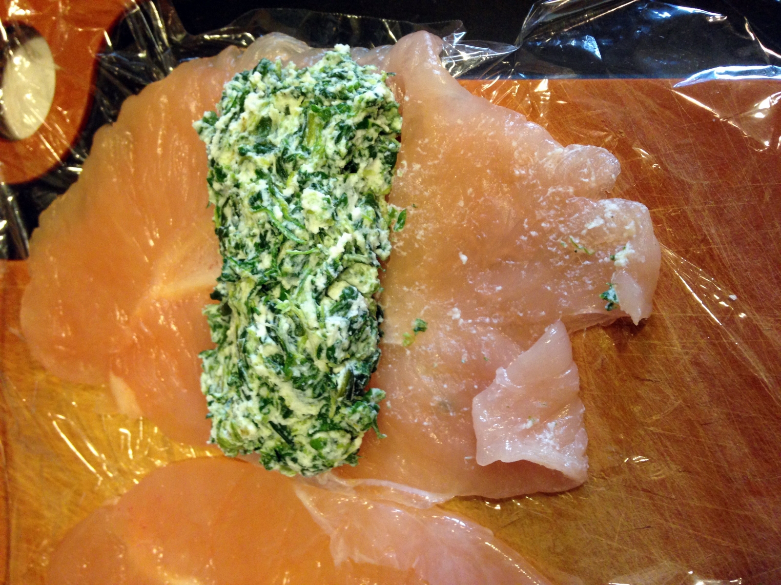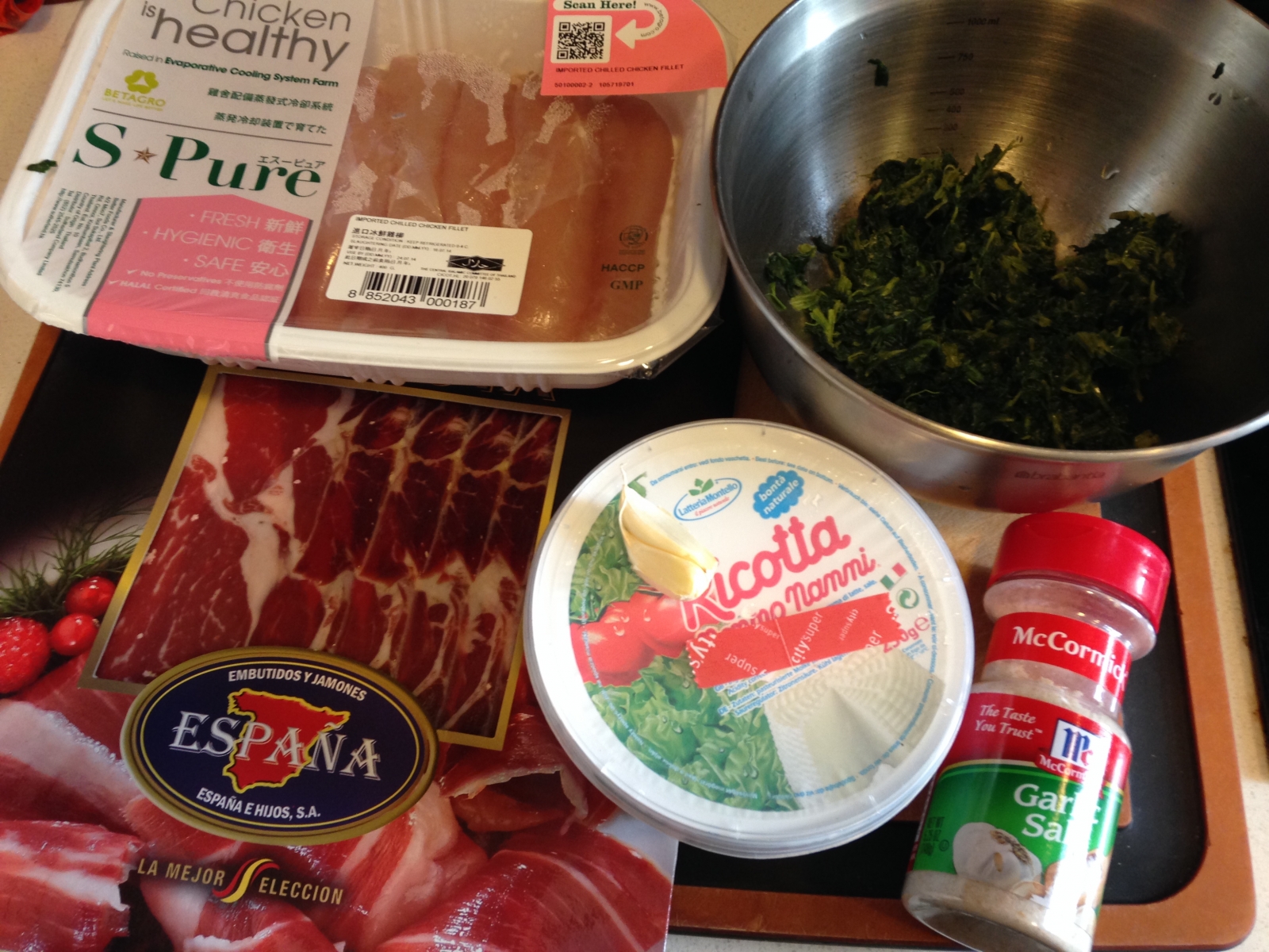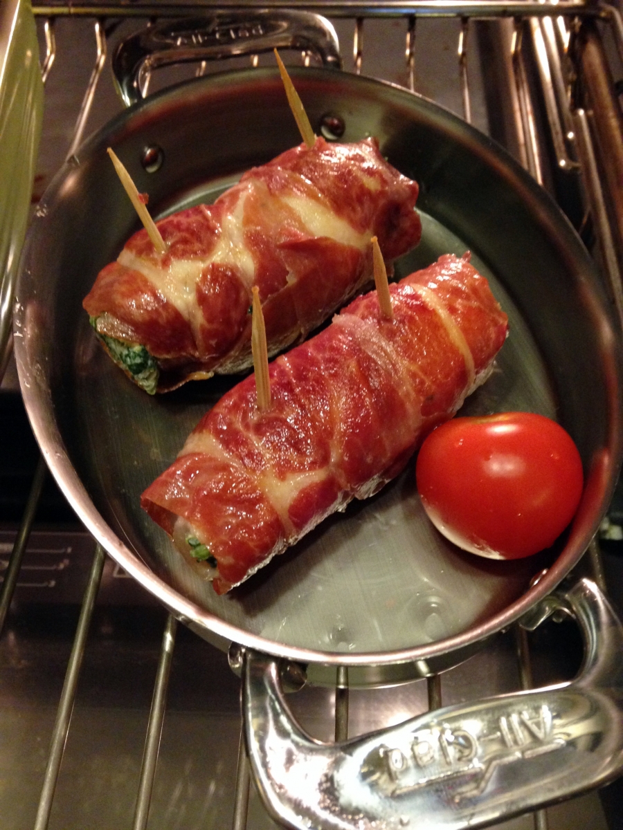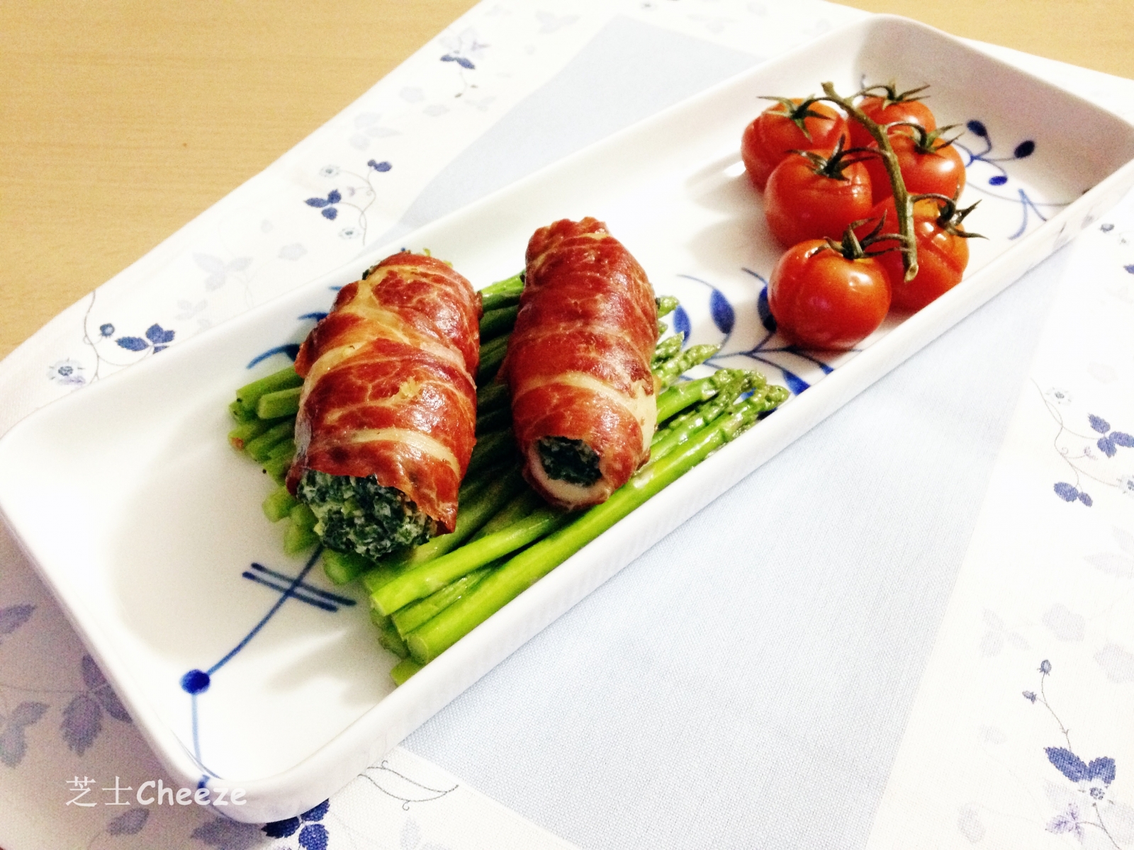 4. 在雞柳上放上菠菜芝士餡, 然後將雞柳捲起包住餡料, 再用Parme Ham包住雞肉卷;