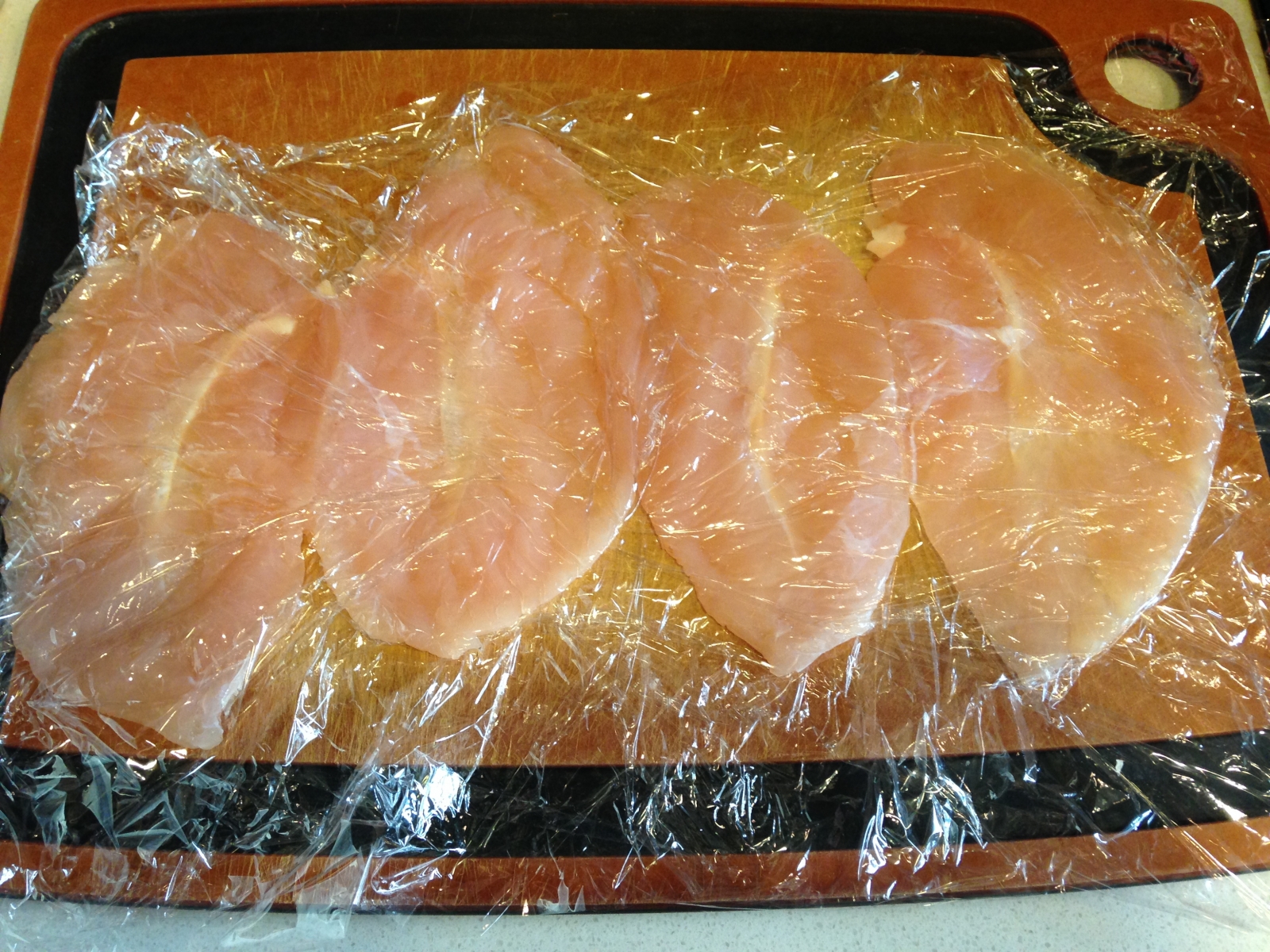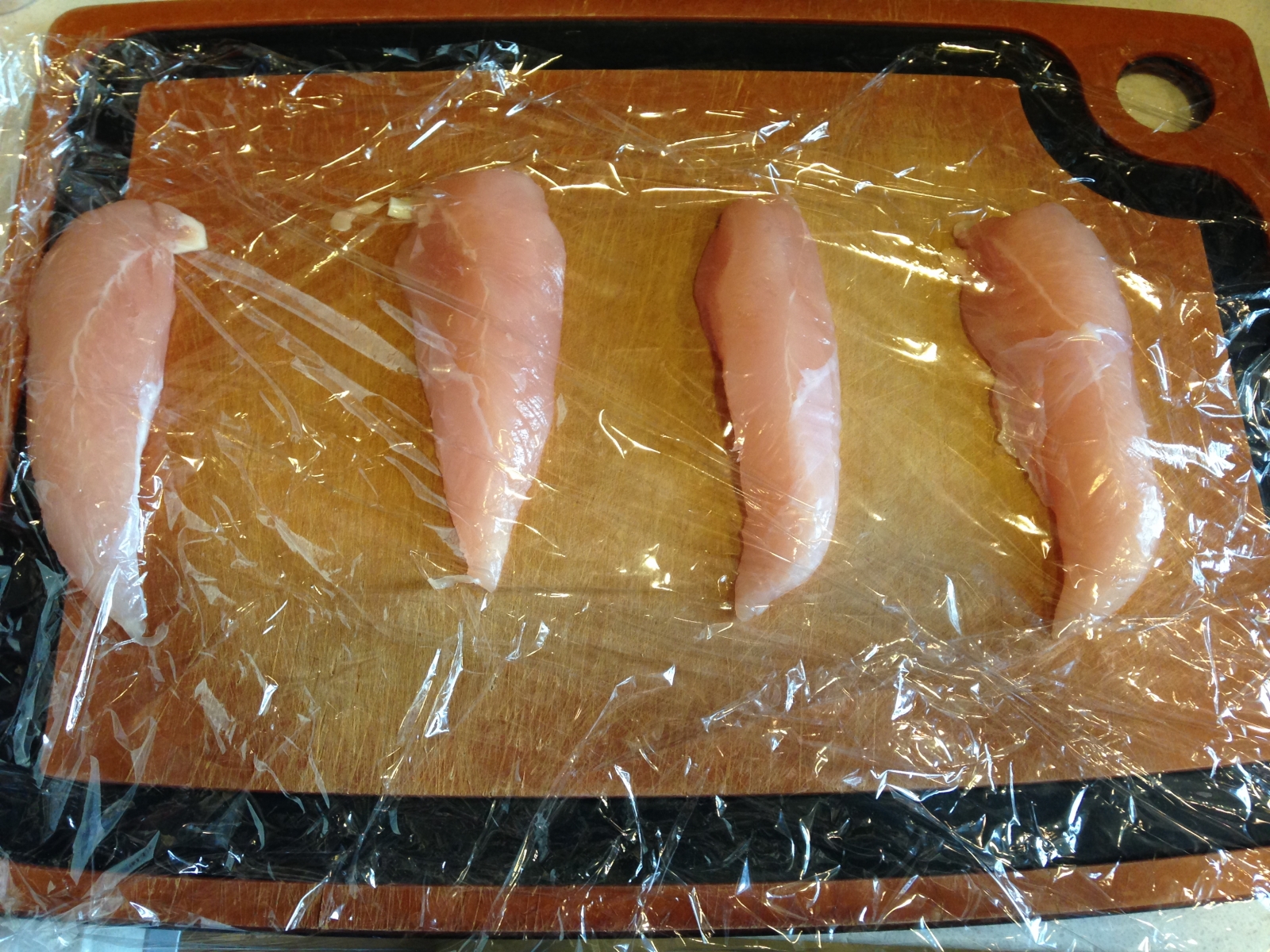 2. 另一面先在枱上舖上保鮮紙, 再將雞柳放在保鮮紙上, 中間留有一定空間;