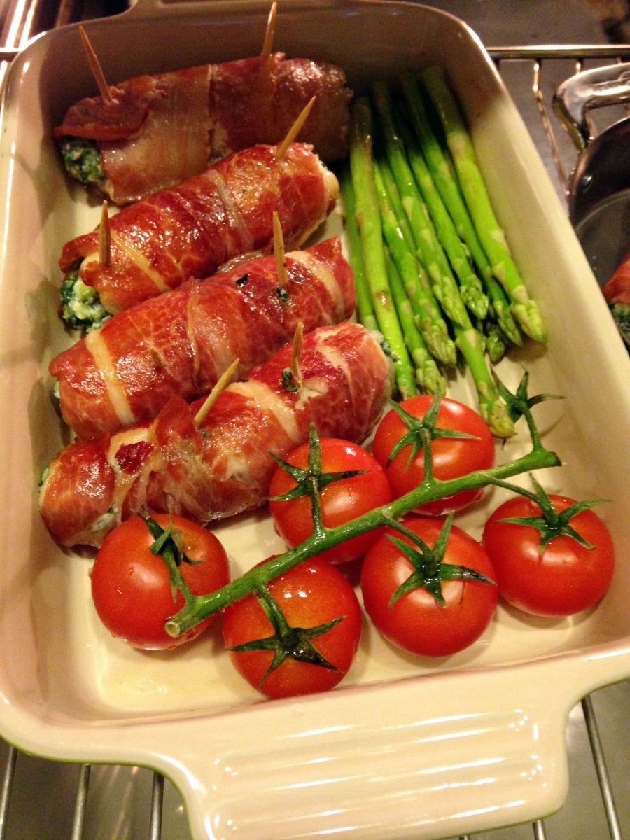 7. 將已煎至金黃色的雞肉卷放入焗盆內, 加入喜歡的配菜, 放入已預熱的焗爐用200度焗12分鐘; (如果用上煙肉可以焗15分鐘)