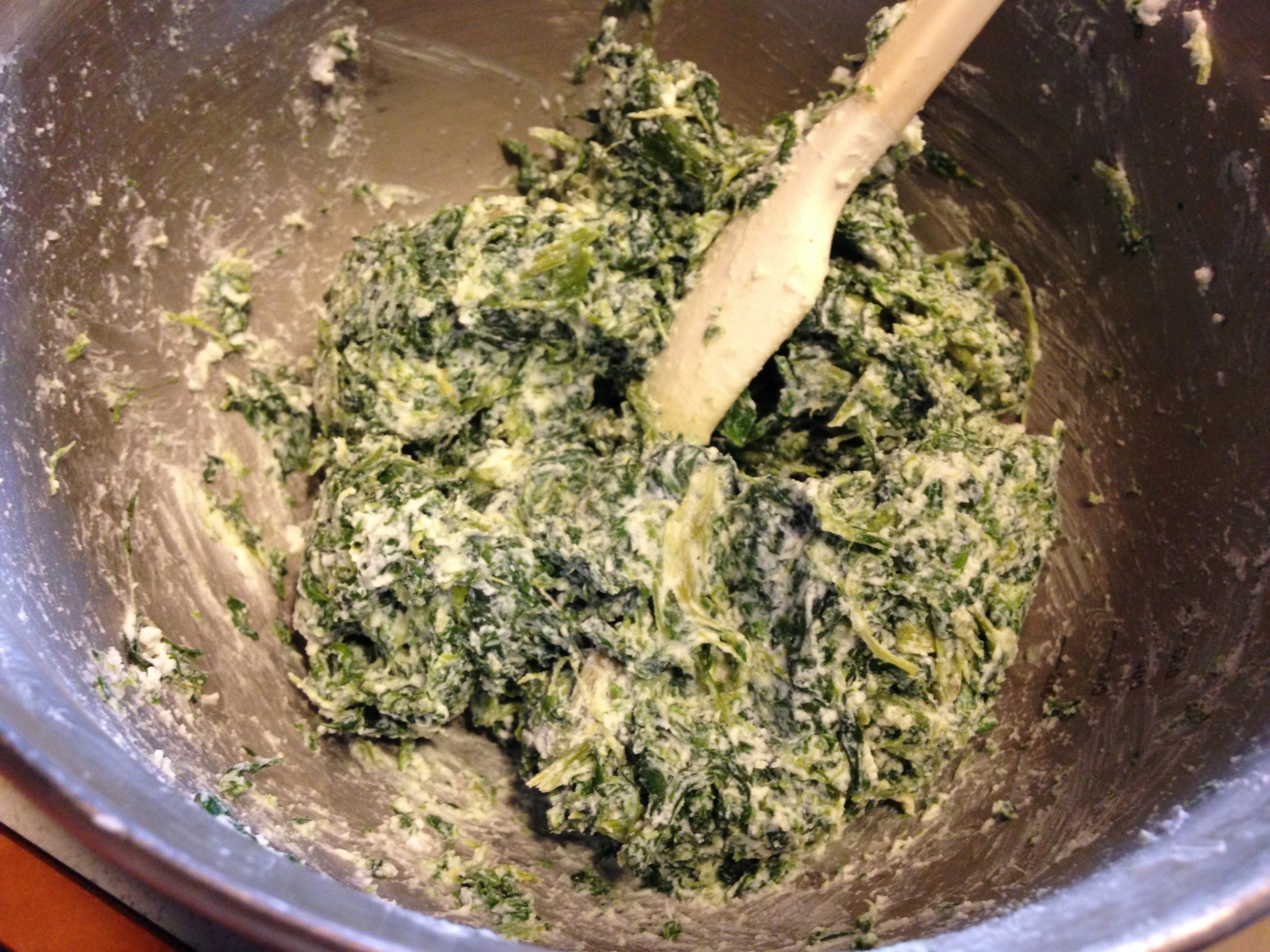 1. 將一盒Ricotta Cheese與菠菜拌勻, 加入蒜鹽, 黑椒拌勻, 備用; 另一邊預熱焗爐200度;