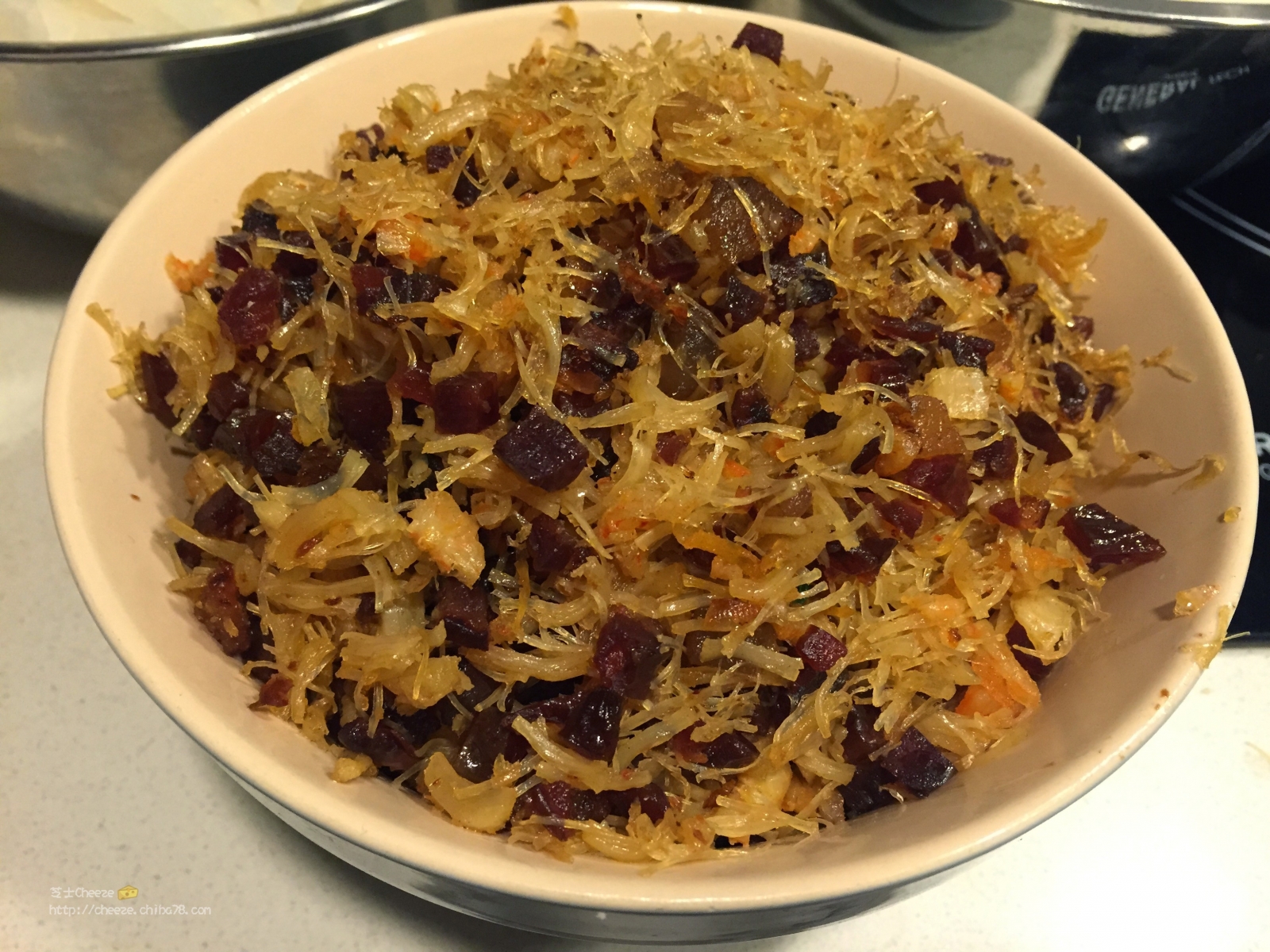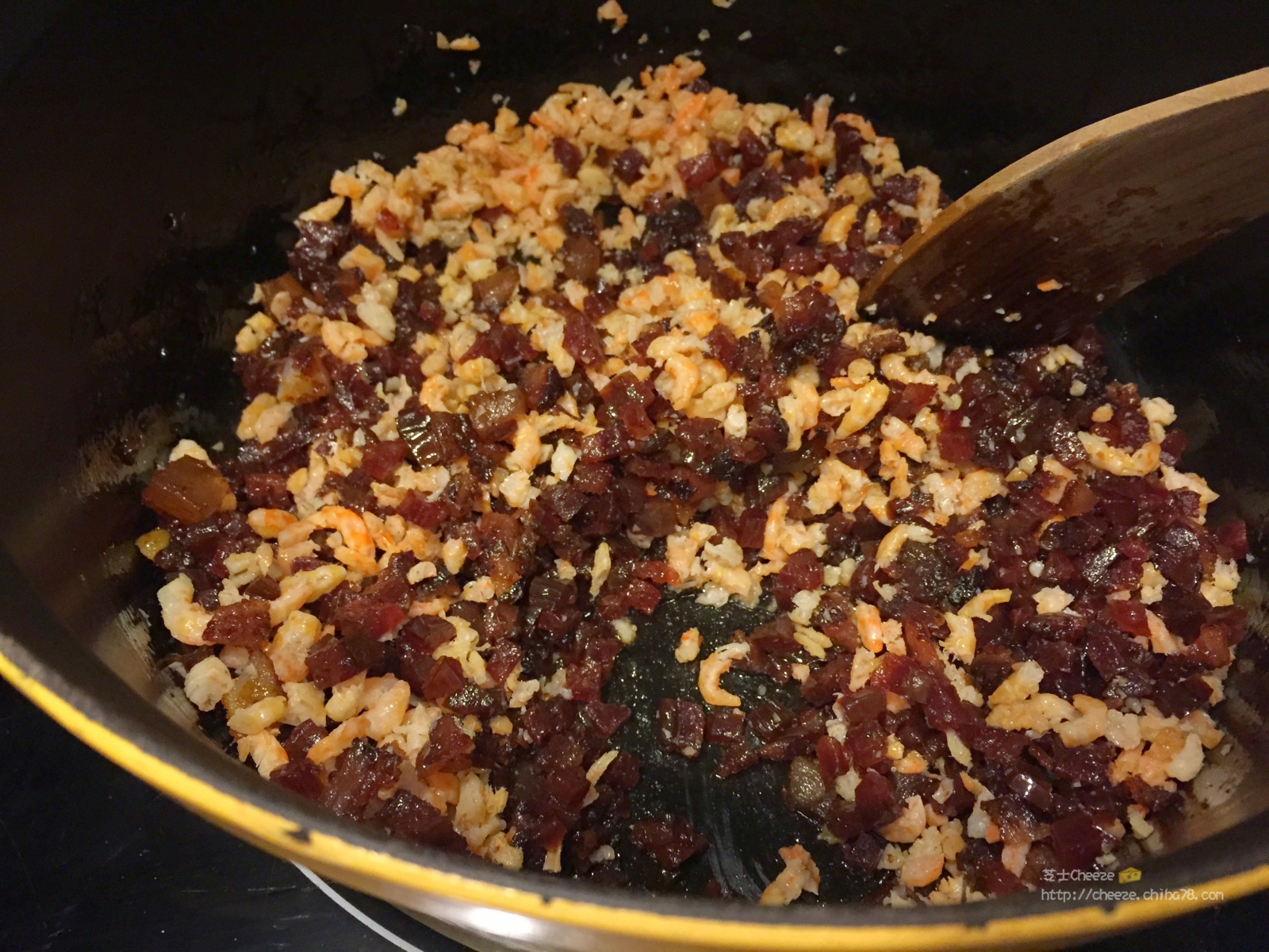 1. 先用水浸蝦米及乾瑤柱,浸好後隔水,蝦米切粒,瑤柱拆絲,水份隔渣備用;(如有冬菇也是浸水後切粒,冬菇水備用)