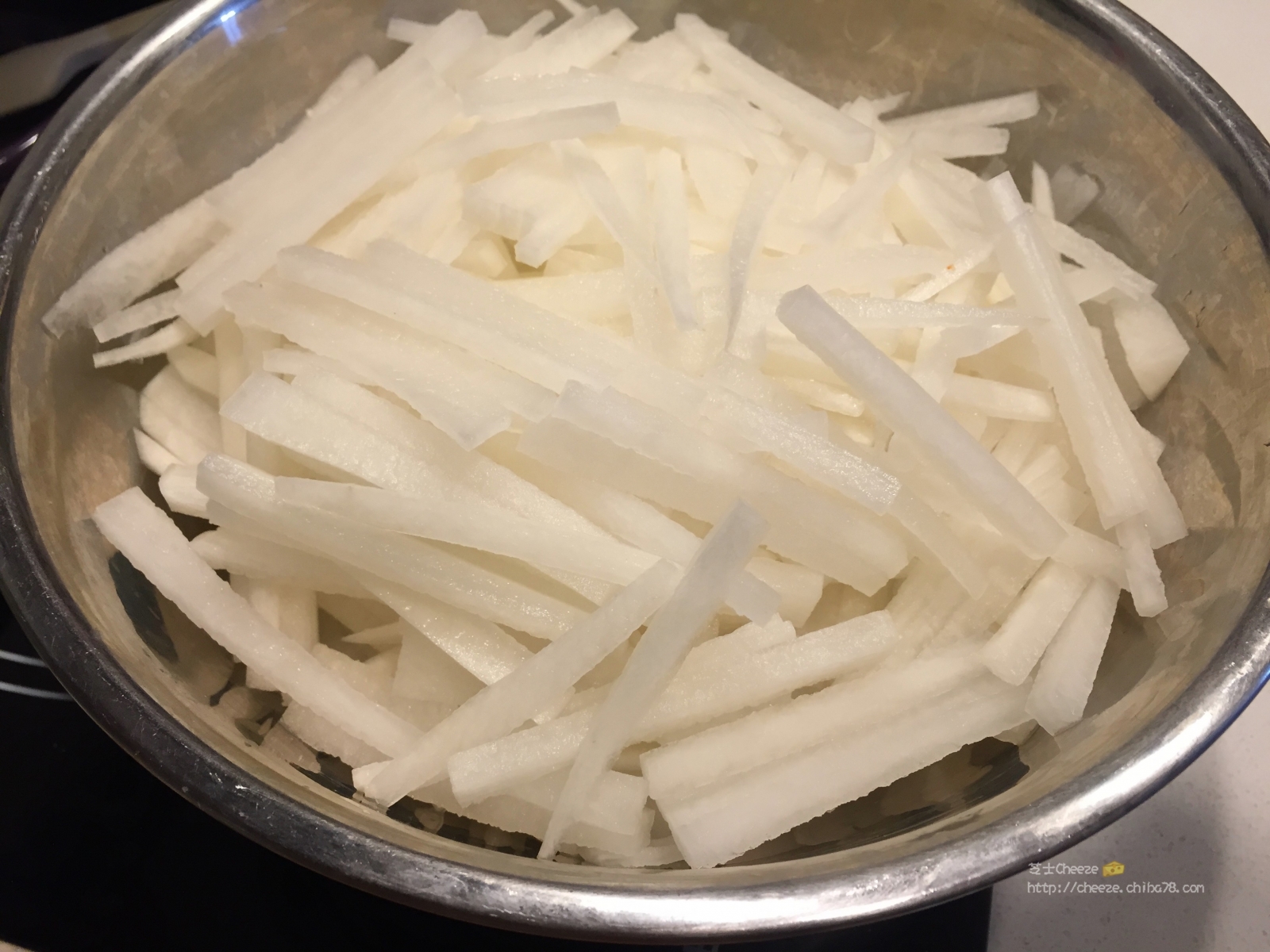 3. 將1/3蘿蔔切粗絲,2/3蘿蔔刨幼絲;