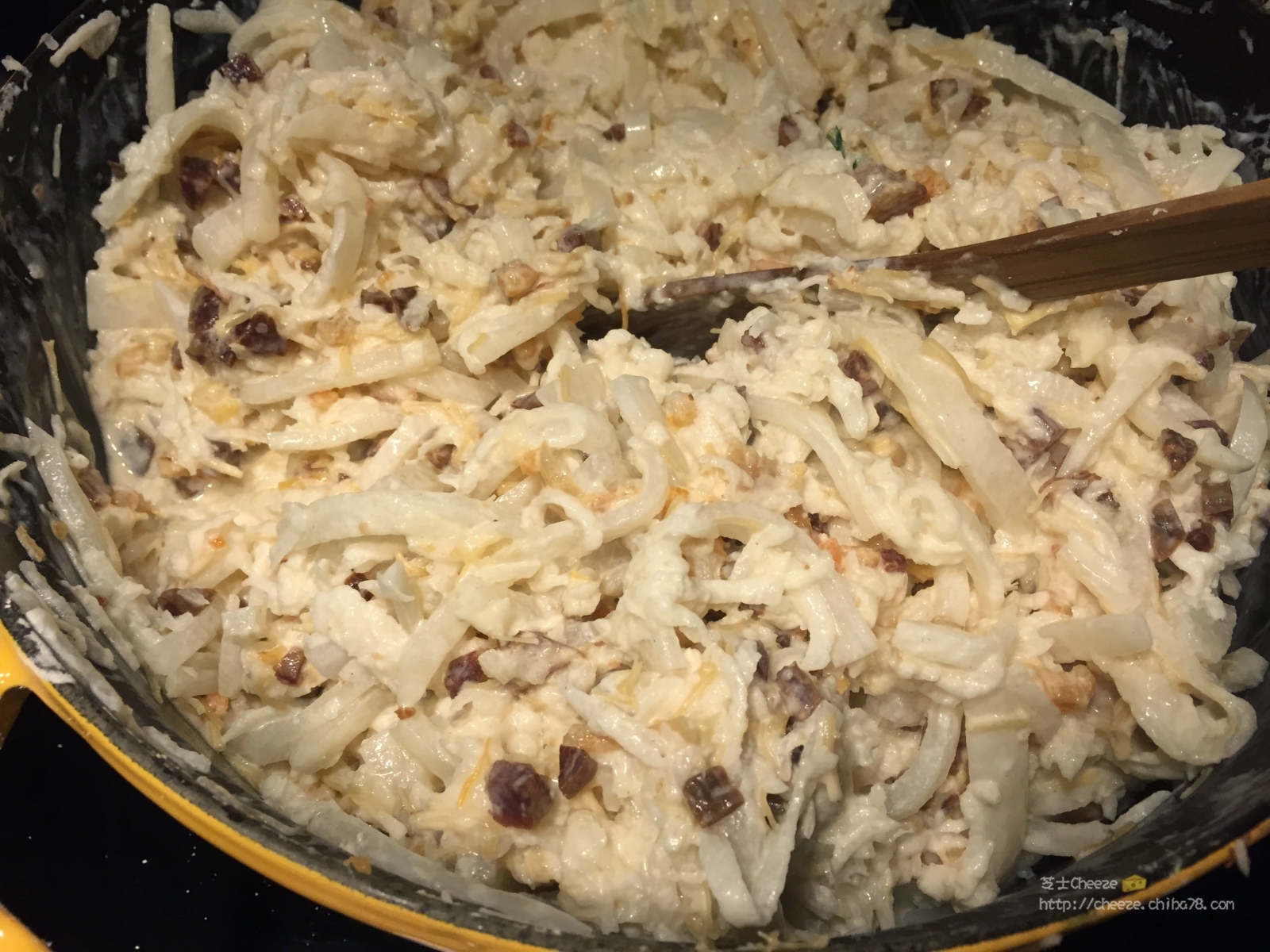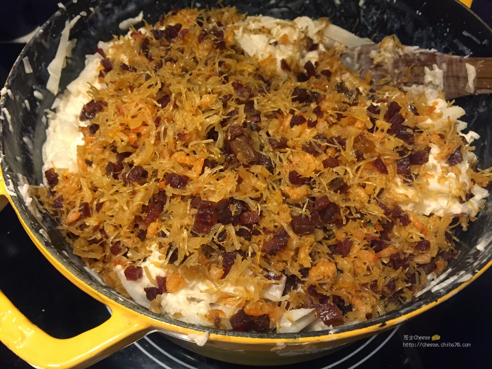 11. 待蘿蔔炒至少許軟身及收乾水份,加入粉漿(此時我會先關火,撈好粉漿後再開火炒,因為我份量比較多),繼續翻炒一會,待水份收乾至約1/3材料的高度,粉漿亦好明顯掛到蘿蔔上,(這個是較硬身的做法,如果想軟身一點,可以不用把水份收得太乾, 約是4成高度),熜火加入2/3 臘腸、臘肉、蝦米及瑤柱撈勻,餘下1/4留作鋪面用;此時試味如果仍不夠味道可再加醬油或鹽調味,但注意臘腸及臘肉於蒸後會比蒸前咸。