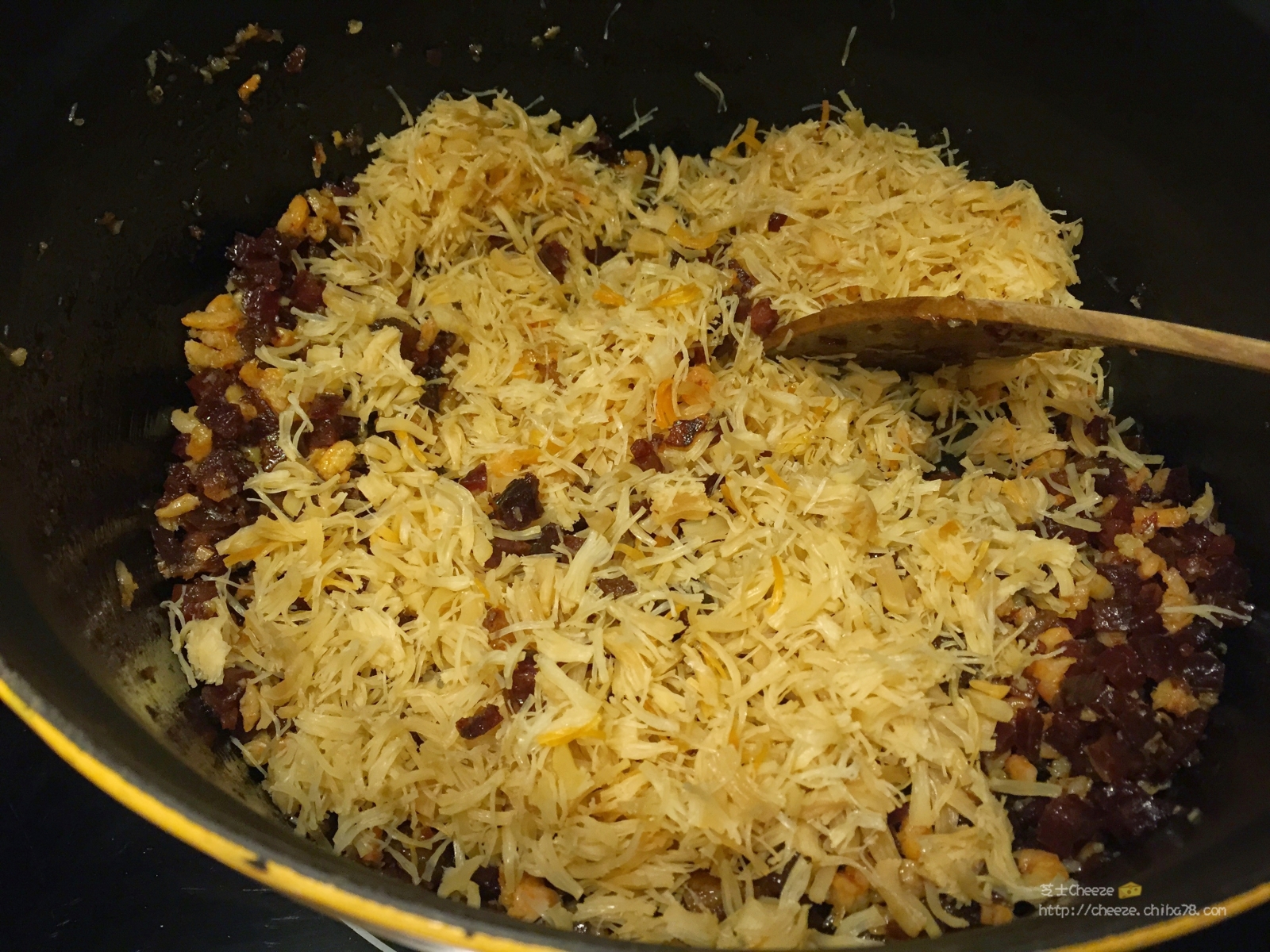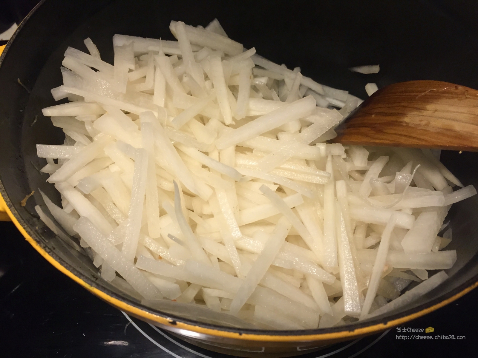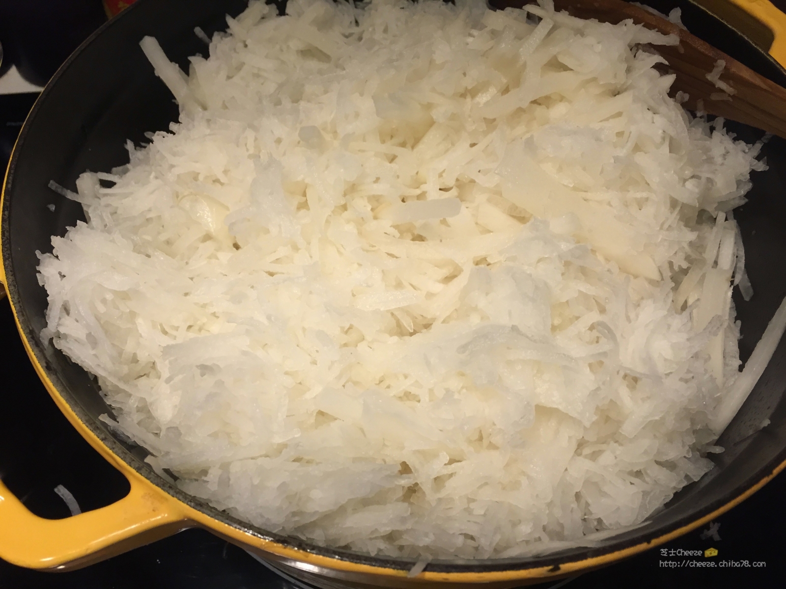 10. 待見蘿蔔條表面已透明,加入幼蘿蔔絲再炒一會;