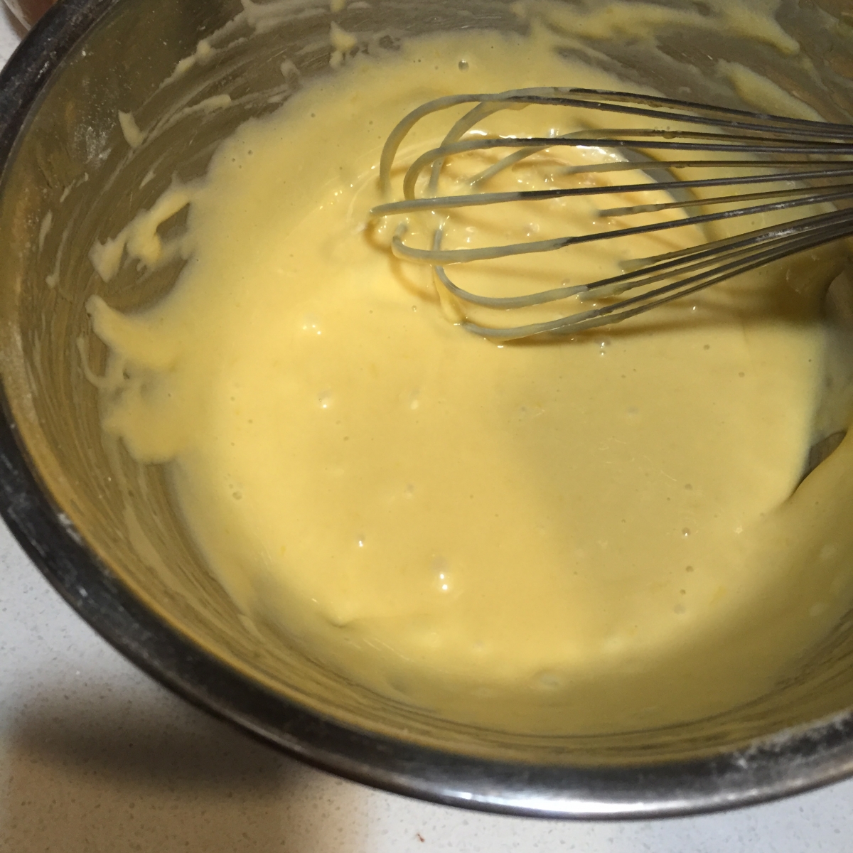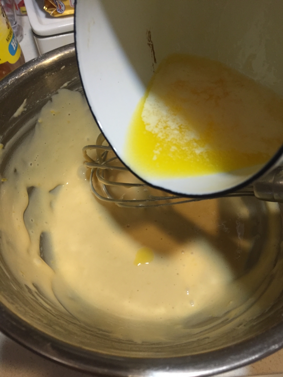 5. 分3次將牛油加入(4)中,每次均拌勻牛油後才加第2次;