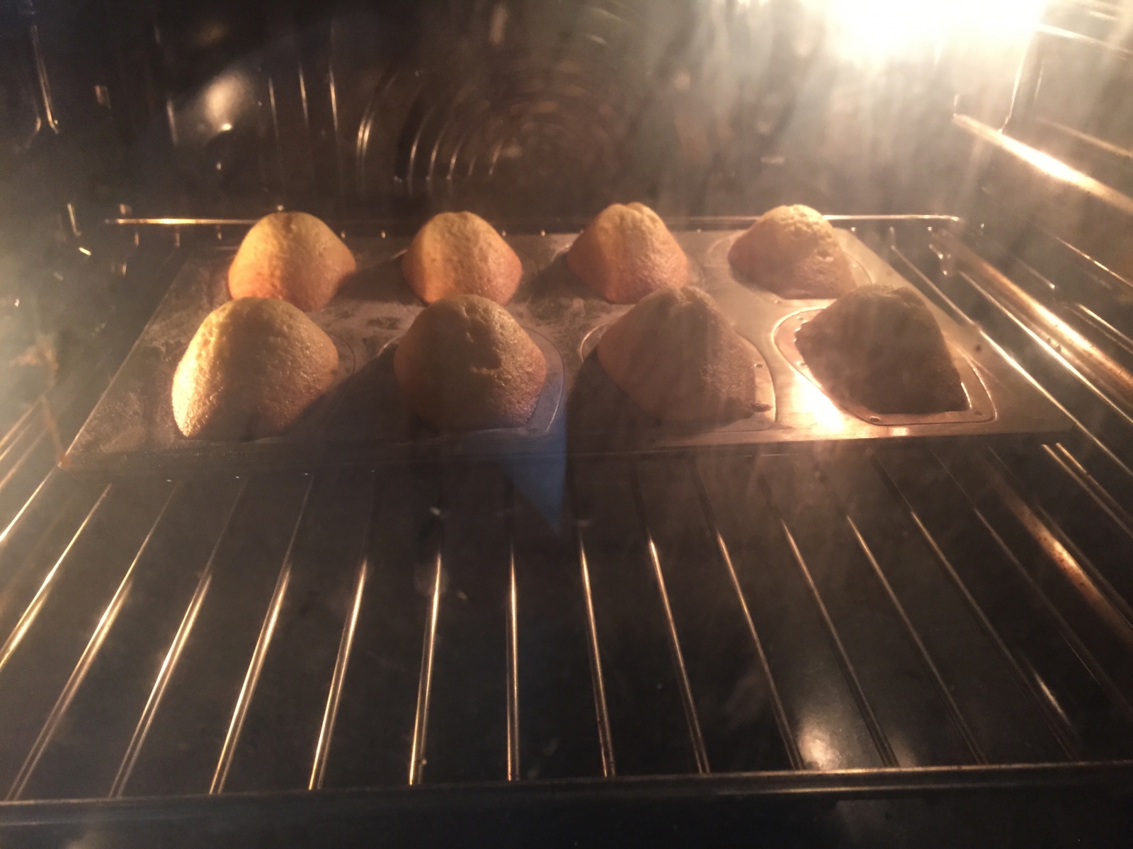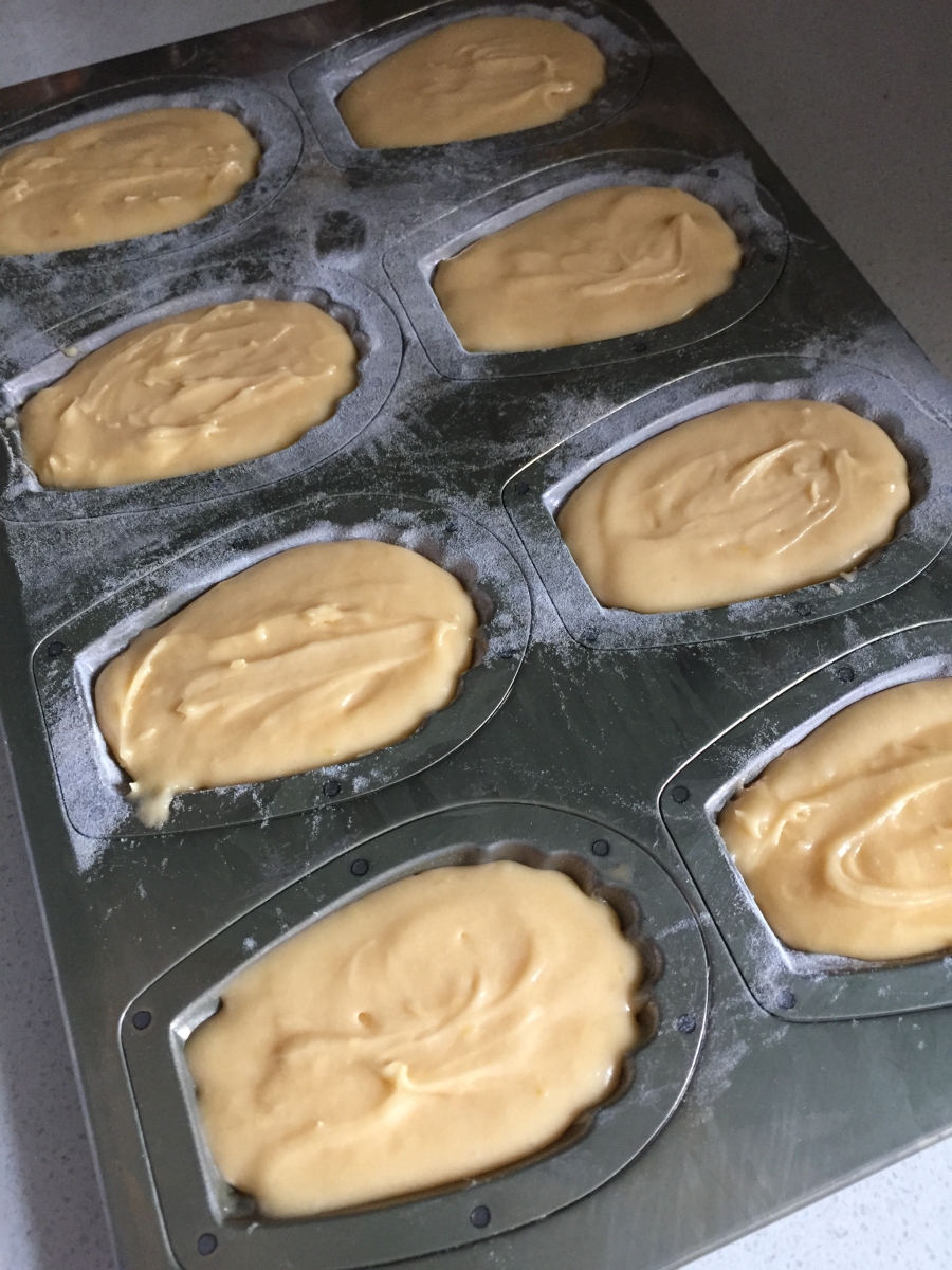 8. 將已靜置好的麵糊唧入模具內,放入焗爐焗14分鐘。(我沒有焗18分鐘,因為模具很易上色會變燶,如果用大型有風扇的焗爐,可中途降低至170-175度,馬德蓮成品顏色會淺一些)