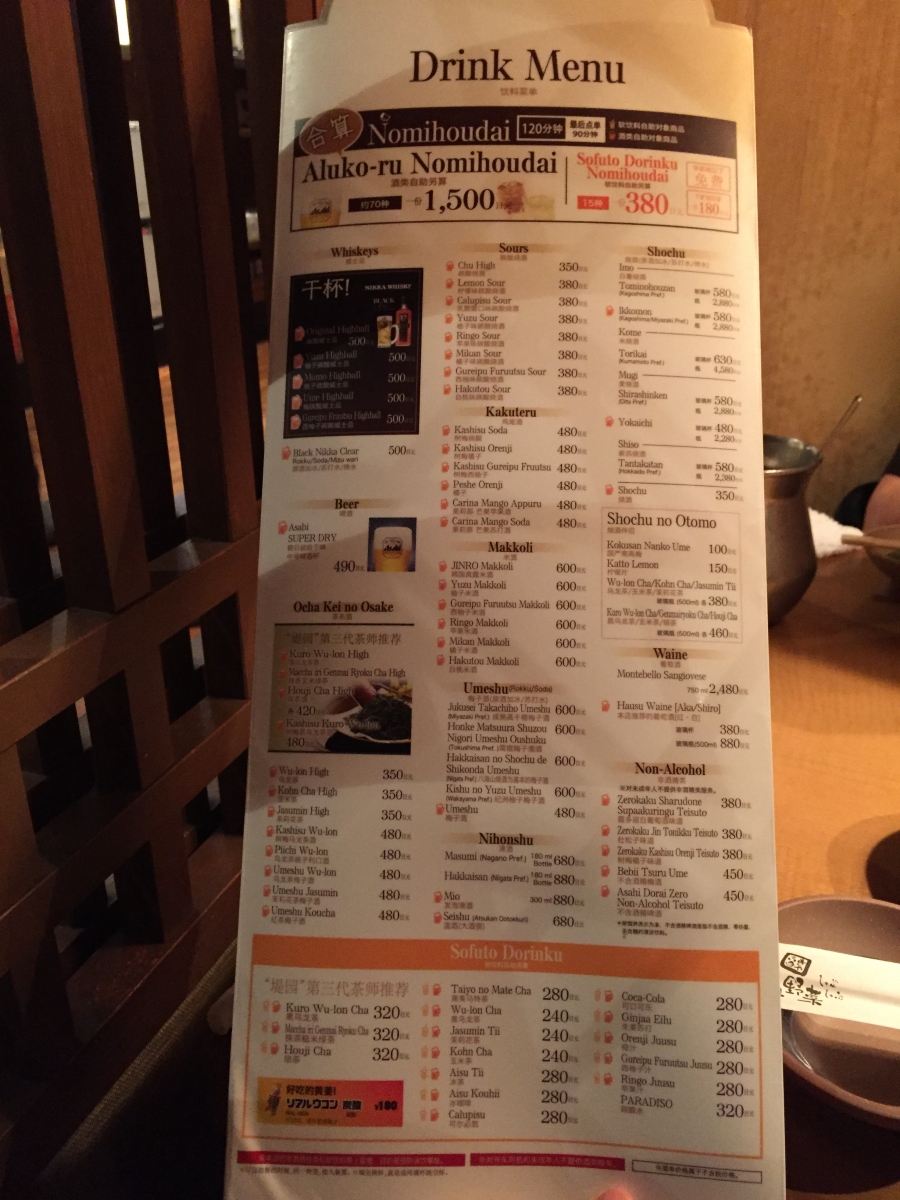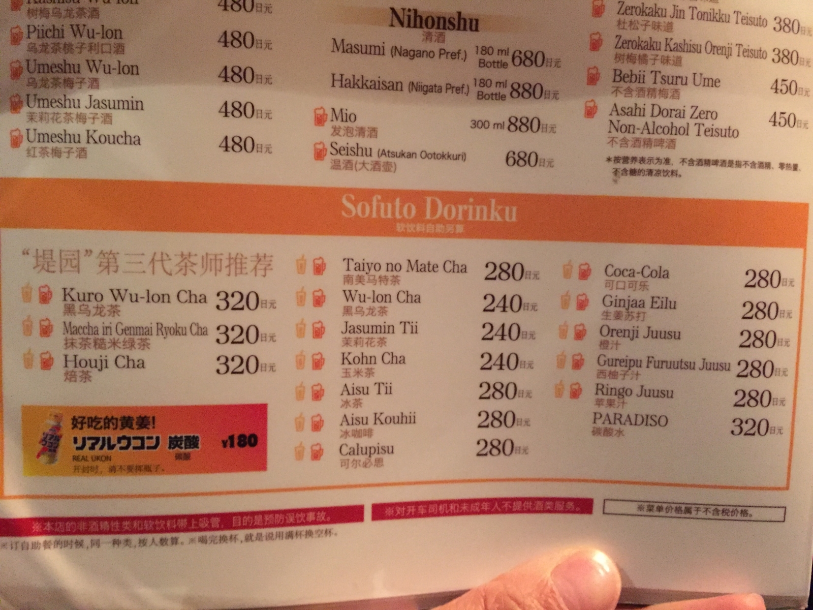 吃放題也少不了要喝點有汽的飲料,我們就選了加380yen的飲之放題,當然就不可以點上面的酒類飲品,只點下面Soft Drinks部份,但也足夠了。