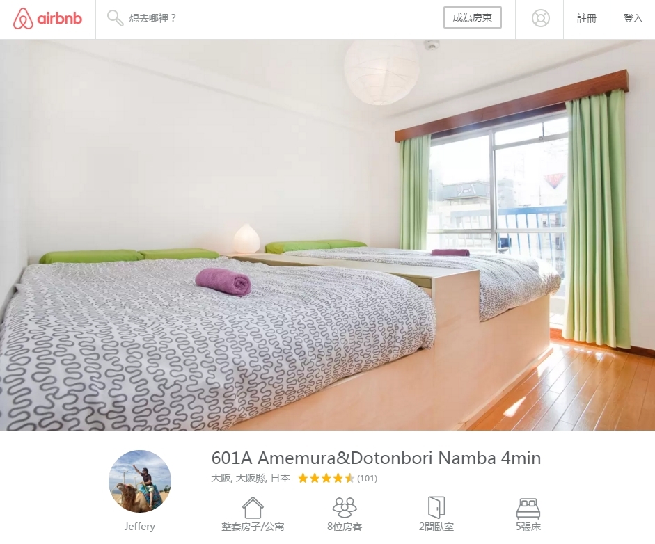 好友上次去大阪時一家人都住過Airbnb,所以都推薦了我同一個Host的住宿,本來想租住近難波駅附近的住宿,但一早已經沒有房了,退而求其次就發現了同一個Host在西心齋橋601A的住宿,有4張Queen Bed加一張梳化床,感覺不錯就決定了租住,計算起來每人都是一晚3百多一點,實在是非常化算。