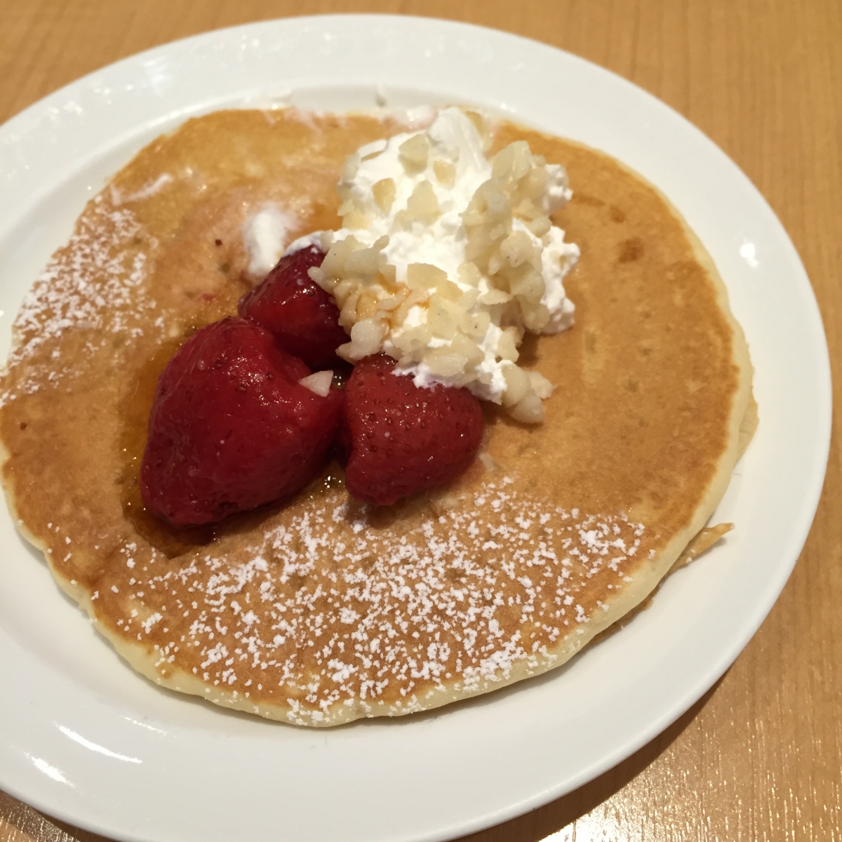 士多啤梨Pancake,士多啤梨是糖漬過,少許軟身,酸酸甜甜好開胃。Pancake鬆軟很好吃,又沒有吃後在口腔"立"住的感覺。