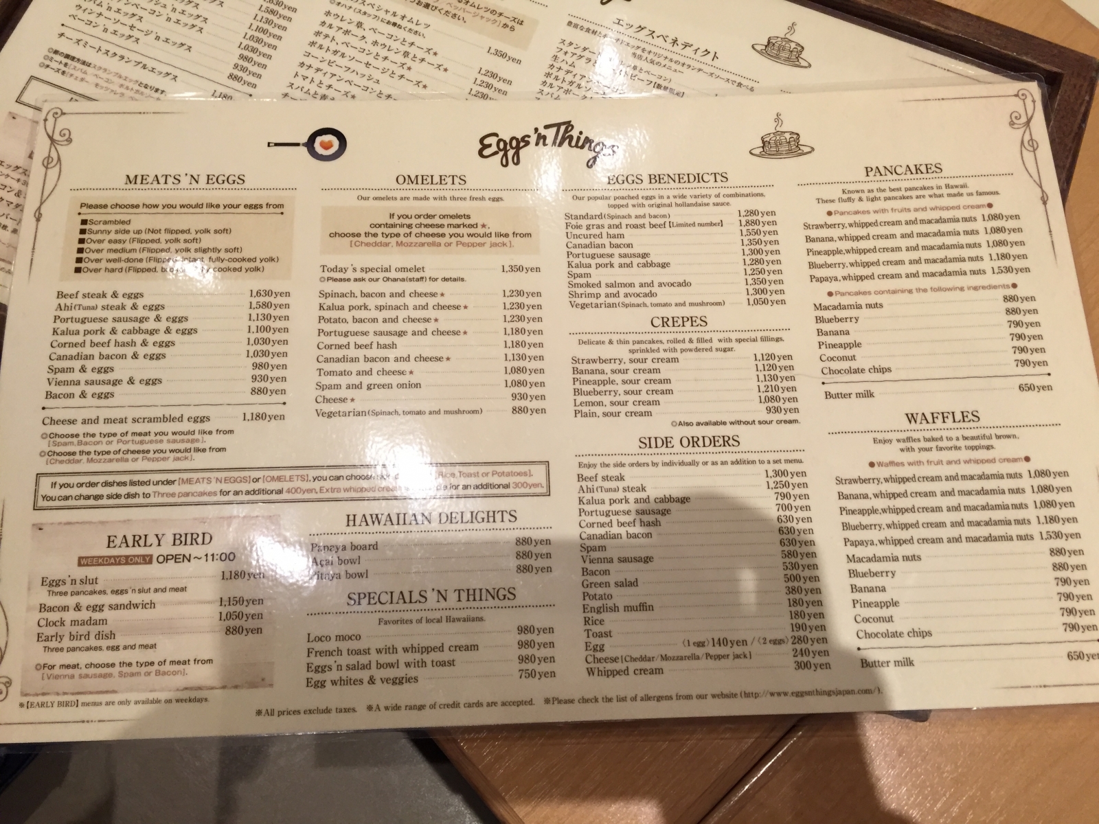 話明今次旅程是食敗玩,食當然是行先啦,在計劃旅程時都會找找吃什麼,特別是早餐,在日本都是有和式或西式早餐的選擇,一件土司加咖啡又或是一份鮭魚定食就是很平常的選擇。以前跟芝佬一起在日本吃早餐主要是和式為主,今次在瀏覽網站時發現超人氣Pancke店 - Eggs'n Things。早上吃Pancake也是不錯的選擇,我也非常愛吃,在香港就少之又少,有賣的但也不好吃。所以很期待這家店。