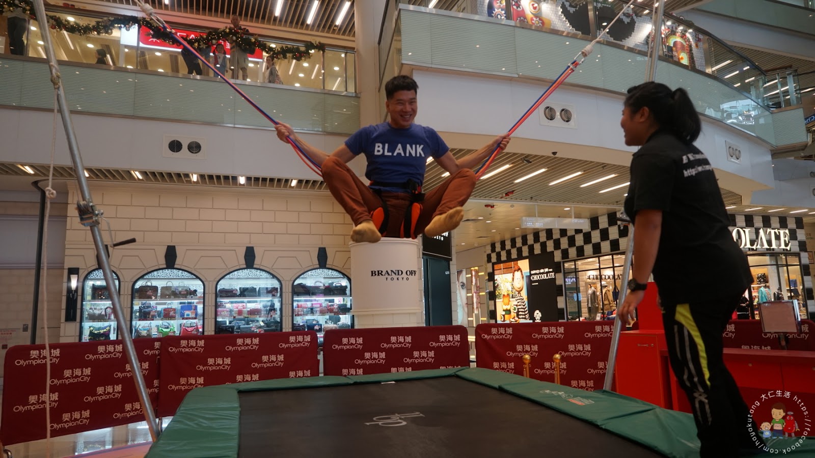 彈床上有教練可以幫你翻根斗, 教練:「你跳高D, 舉起雙腳, 我會幫你」(多謝教練~)