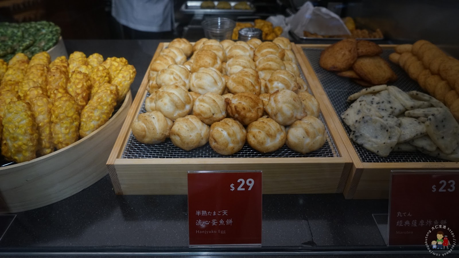 最多人買就是流心蛋魚餅 $29, 朋友Edward:「真係好流心, 簡直黐實咗個口」, 店員推介我食香蔥檸檬魚餅 $23.