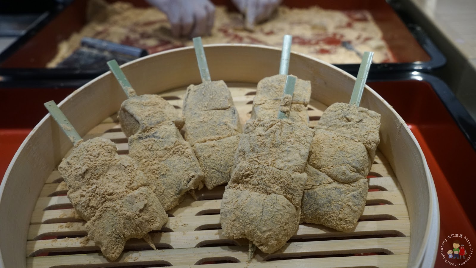 我:「你哋用黃豆粉, 我最初以為係焙茶... 不過, 你哋做到大大舊, 一串三舊$38又唔錯喎」