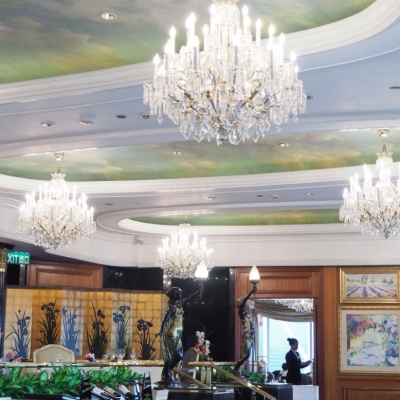 裝修設計用上大量石頭 木材 與華麗的宮殿水晶燈作出對比