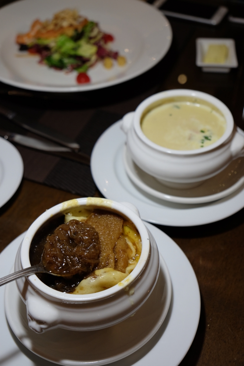 自從上次在另一間酒店喝過之後,洋蔥湯 ($98)便成了另一個心頭好,今次亦沒有令自己失望,在溶化的芝士下,是煮至近乎糜爛的洋蔥絲,甜味都已經跑了出來,濃郁芳香,甜美可口,的確是有水準,亦值得推薦。