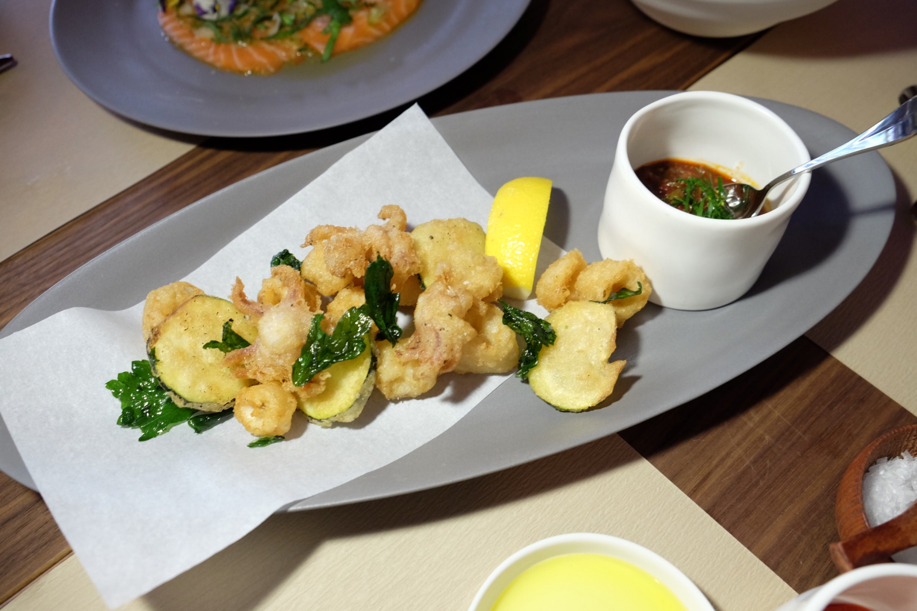 未知是否餐廳的背景,引入了上海菜中常見的珍珠葉,帶有濃烈的椒鹽鮮魷的影子,但辣蕃茄醬加入了黑橄欖油及酸豆,味道真的很特別。