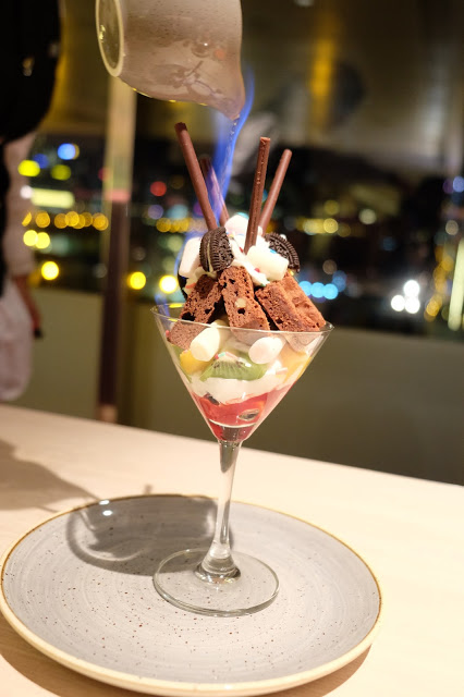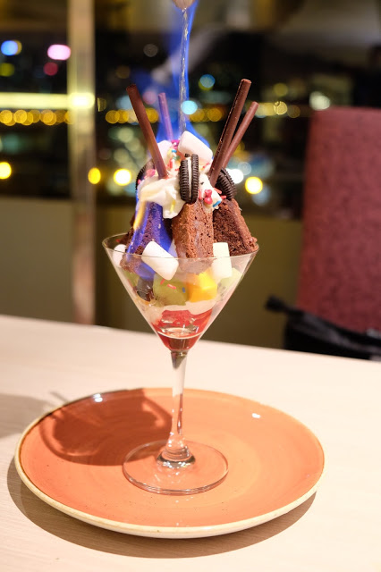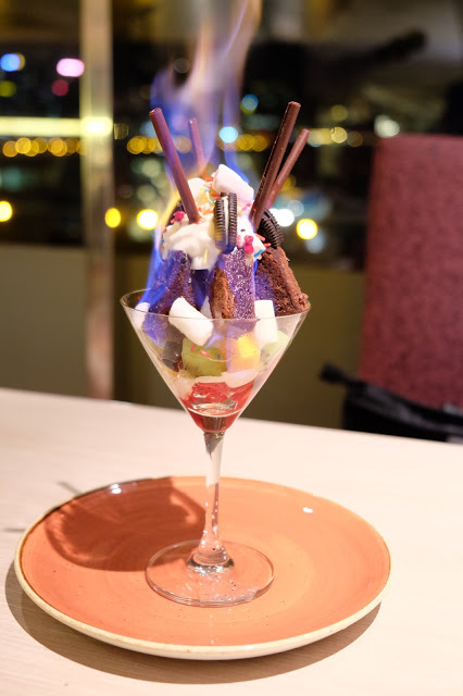 以馬天尼杯作食具,推上大量的chocolate browine及yoghurt ice-cream,上檯時淋上rum酒再點火,豔麗色彩即時浮現,真係睇得又食得。