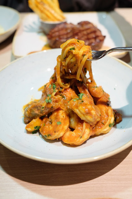 賣相真的夠誇,用上四隻勁大海蝦,足以令閣下回本,雖然麵條仍然偏腍,但有改善空間,扁意粉的掛海鮮汁能力一流,值得一試。