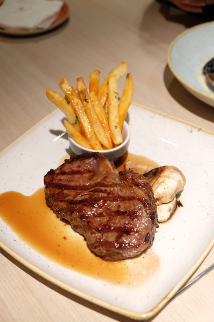 這道菜要另加 $60,但算起來,埋單都不過 $300左右,厚大的西冷牛扒,當然最好是medium rare處理,但今次略為過火,但無損濃郁的肉味,灑點海鹽,肉味就更突出,至於Side Dishes的薯條是即炸的,脆卜卜又熱辣辣,而大蘑菇沾上了肉汁,都變得非常吸引。