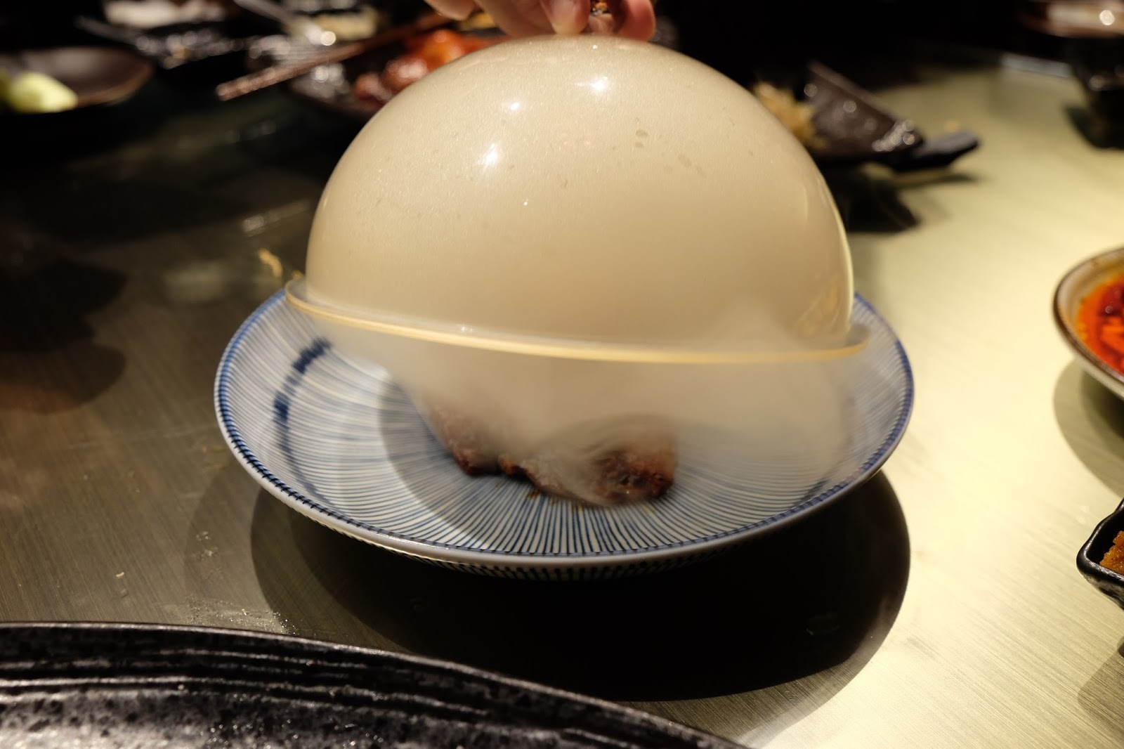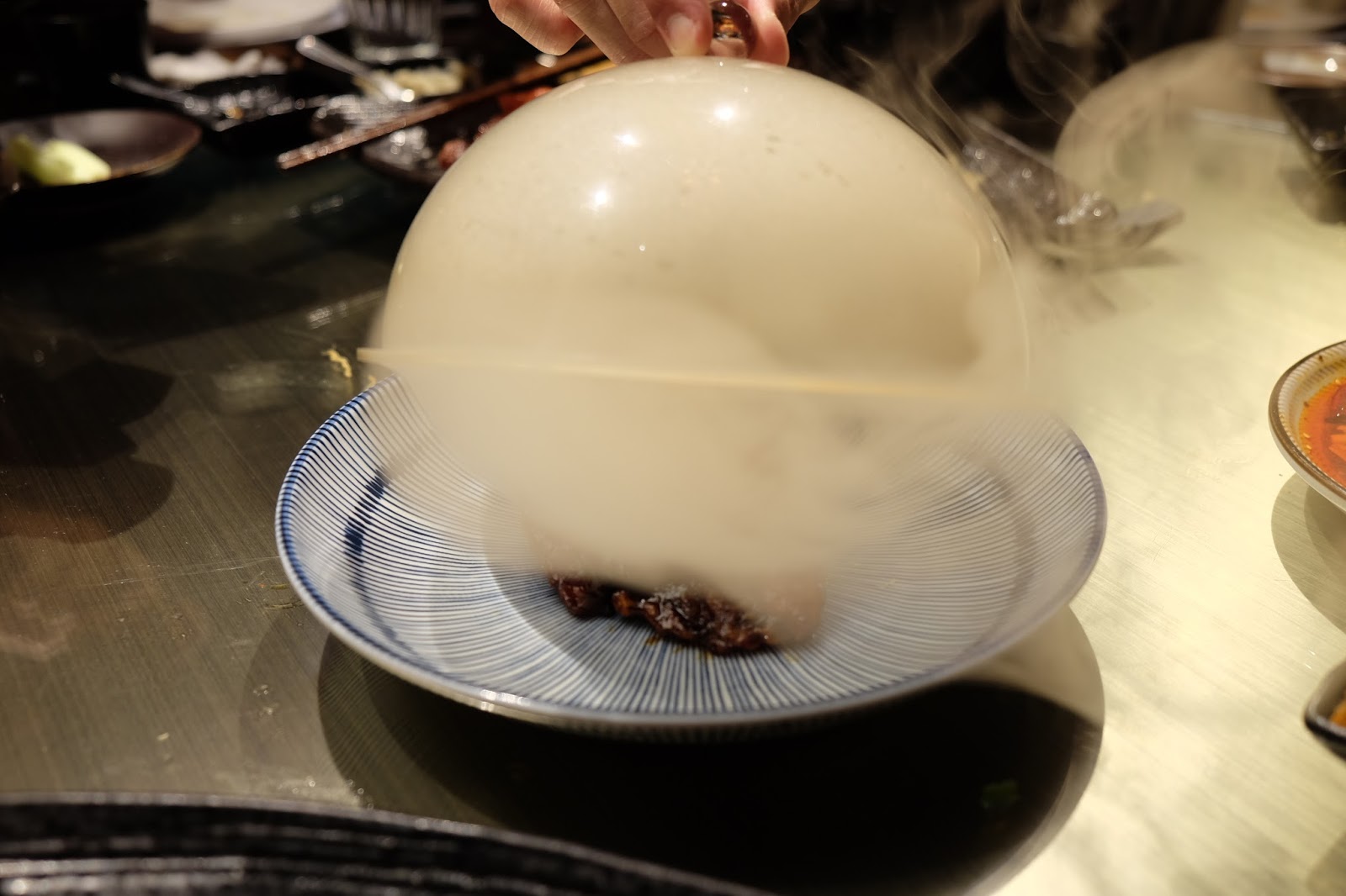 煙燻黑鱈魚 HK$250 整晚菜色中,賣相最出色的一道菜,以桂花木煙燻,所以魚肉帶甜香,侍應慢慢揭開透明蓋時,即時傳出渺渺輕煙,隨之而來是瀰漫了香氣,魚肉外層竟然還帶脆脆的口感,又不會太乾身,實在是色香味俱全的菜色。