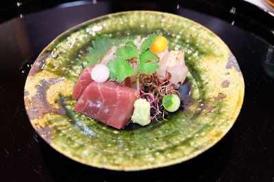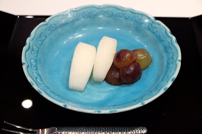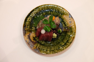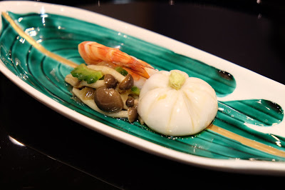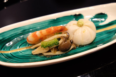即是大家所說的前菜,賣相別緻可愛,渾圓的小袋,原來是合桃豆腐,飽滿又充滿彈性,柔韌而芳香,放上少許即磨山葵,令味蕾的感覺煥然一新,伴以烤本菇、漬苦瓜和熟蝦,帶出不同的質感,實在是一個很有趣的配搭。