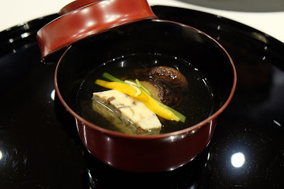 湯料賣相似蒸蛋,原來是用上千葉縣產鮑真蒸打成茸,再混和蛋漿,口感獨特。其他材料還有先炸過的椎茸菇、冬瓜皮、少許薑、金針花和及柚子皮,喝起來充滿了馥郁的清香。