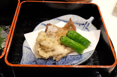 有舞茸天婦羅、黑鯧魚田揚及小唐辛子,先試舞茸天婦羅,脆漿夠薄,而且油份瀝得清,絲毫沒有油膩的感覺,油溫的掌控非常準繩;黑鯧魚有種外脆內軟的口感;小唐辛子只有些微的辛香,個人反而喜歡放到最到先食。