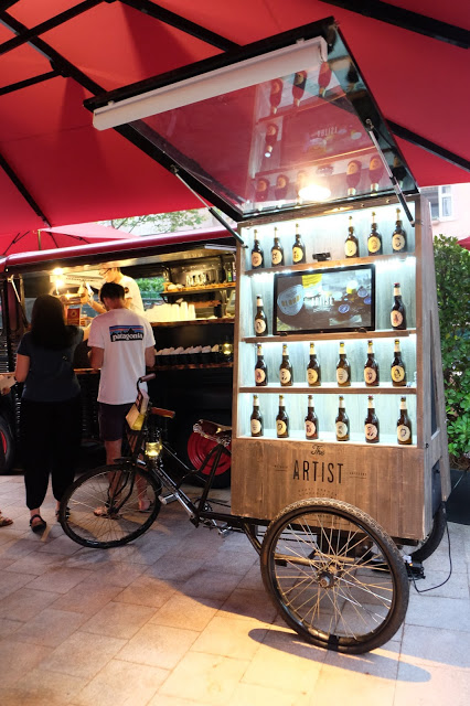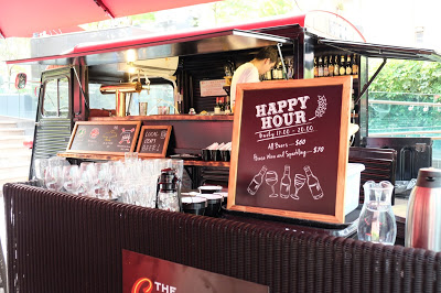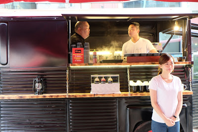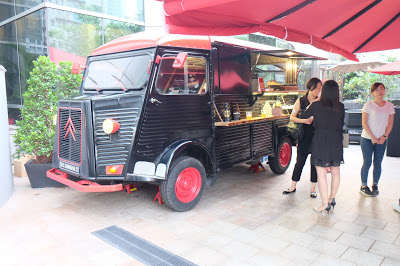 中庭位置擺放了兩輛法國的雪鐵龍古董卡車,塗上了紅黑色,十分有型格,經改造後,車側可以打開,更成為Open Kitchen,方便客人選購食物。