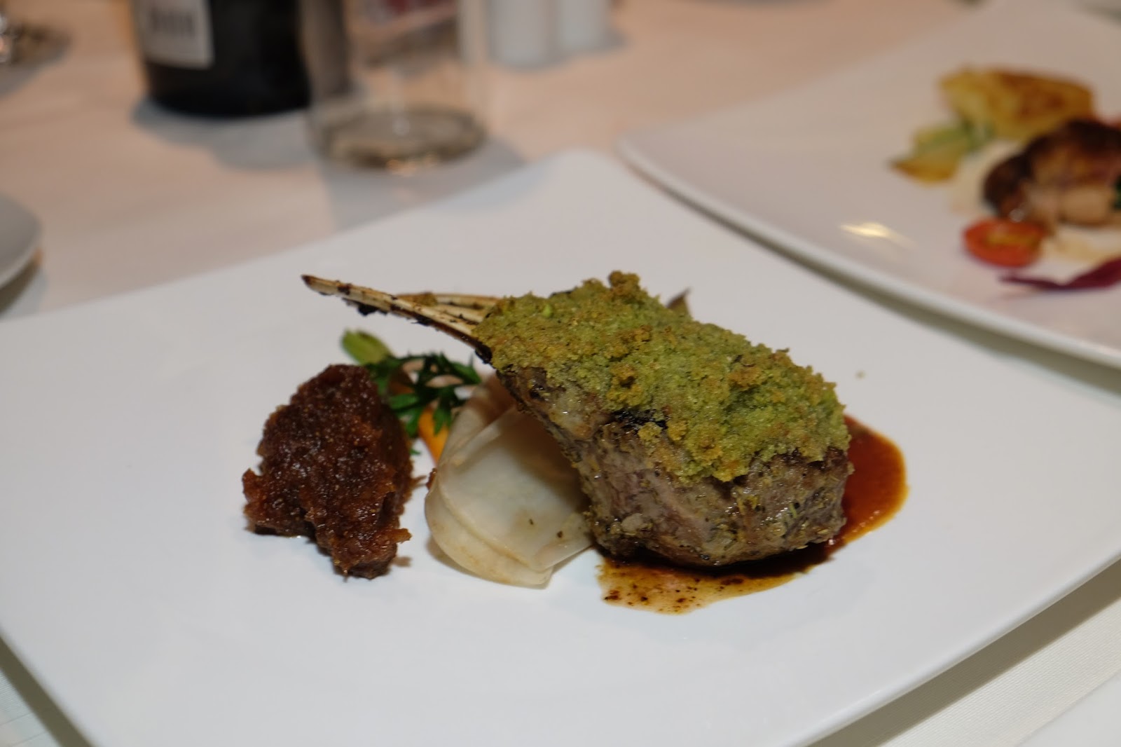 外層有厚厚的開心果仁包裹,但個人認為過猶不及,似乎太多了,幸好切開羊肉時,見肉質仍是胭紅色的,羶味又輕盈,一般人都容易接受。
