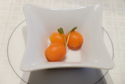 餐前送上簡單的前菜,原來是褪皮的小蕃茄,輕輕一咬,微酸的汁液隨之而來,帶來了舌尖一陣清新的感覺,正好迎接之後的美食。