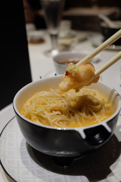 未放上檯,濃郁的龍蝦味已經瀰漫,橙黃色的龍蝦湯,舀一口試試,濃稠得帶點膠質,滿口都是龍蝦馥郁的香味,好奇地問一下,原來是用龍蝦殼配蕃茄雜菜湯、肉桂、白蘭地及龍蝦籽熬足三小時,不單將龍蝦味的精華完全溶入湯內,更有雜菜的甜度,不禁從心裡「嘩」了一聲,彷彿是將傳統的中國菜,注入了新生命,融合了法國菜的精髓,麵條蘸滿了龍蝦湯,令人吃到了難以忘懷的味道。