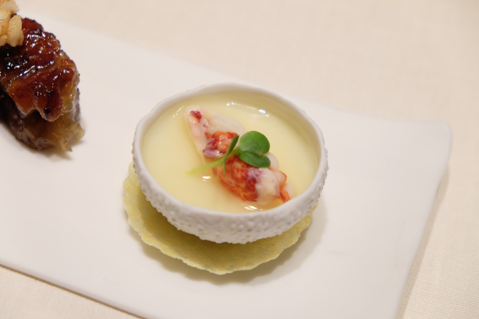 蛋白鮮清甜滑溜,時間上拿捏得相當準確,表面一點氣泡也沒有,法國藍龍蝦同樣的鮮甜可口及爽彈。