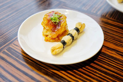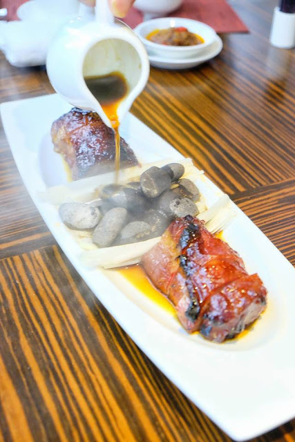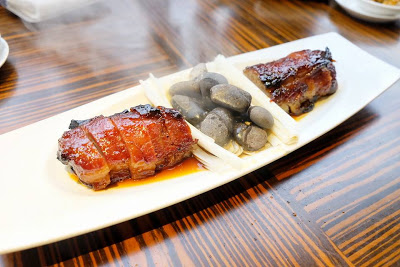簡單的食材,反而帶出大道理,把醬油澆在燒紅的石卵上,散發出縷縷輕煙,視覺效果一流,叉燒選用脢頭心,用豆豉、果皮及蜜糖醃好,在烤焗時先把兩邊輪流烤熟,好令肉汁鎖緊,咬起來不會太稔,仍然保持了口感,好吃到不得了,很奇怪,突然好想加碗白飯伴食。