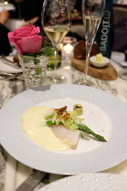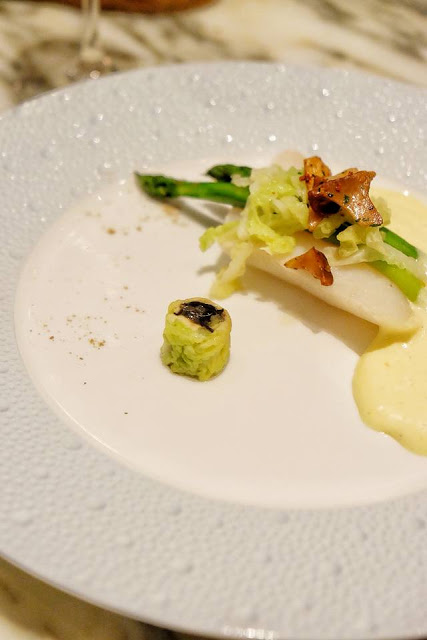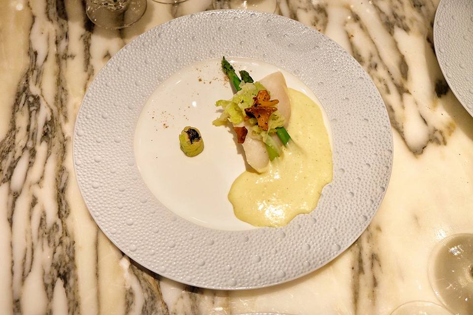 海魴魚伴蘆筍,羊肚菌和煙燻甜蛋黃汁